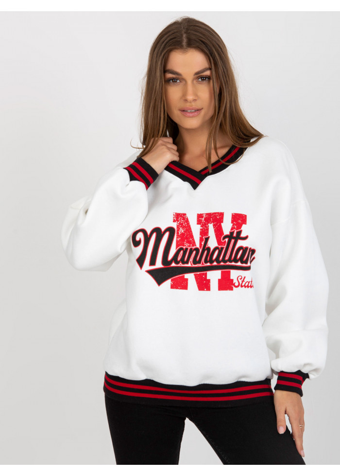 Dámska mikina s potlačou, výstrih do v, kontrastné lemy na rukávoch a v spodnej časti, kontrastný lém v dekolte, univerzálna veľkosť, miery modelky: výška 170 cm, prsia 93 cm, pás 66 cm, boky 93 cm., rozmer produktu meraného na plocho:, šírka pod plecami: 58 cm, dĺžka rukáva: 62 cm, celková dĺžka: 68 cm.
