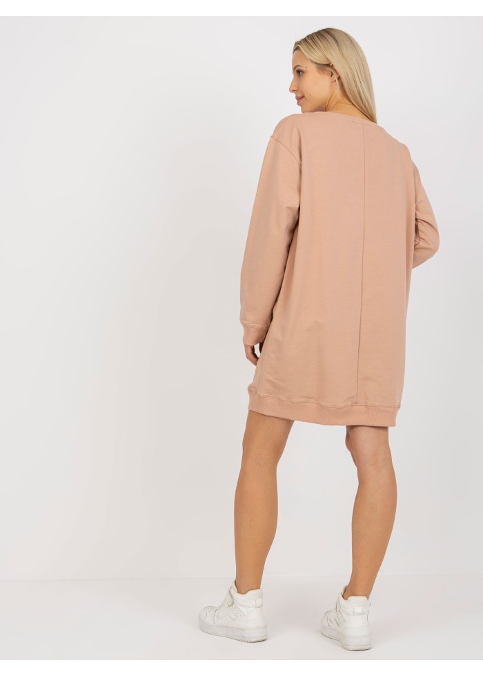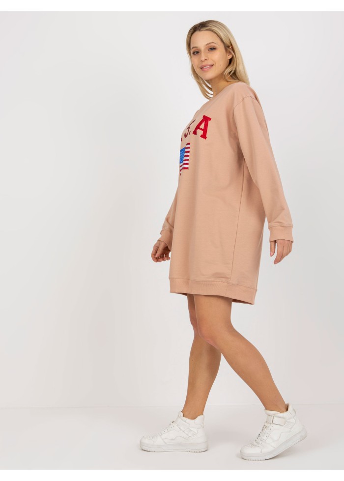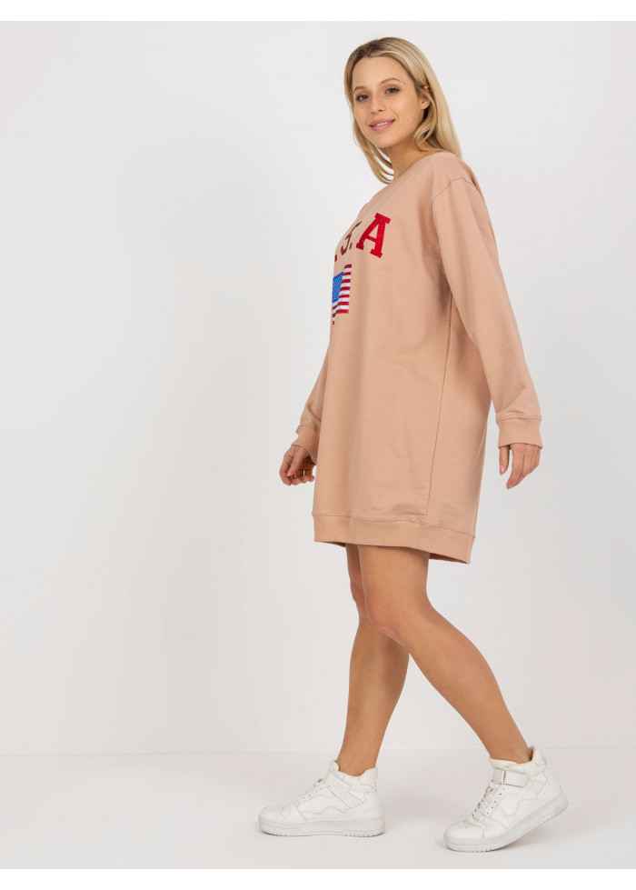 Dámska mikina, ozdobné aplikácie, okrúhly výstrih, lémy na koncoch rukávov a v spodnej časti, módny predlžený strih, univerzálna veľkosť, miery modelky: výška: 170 cm, prsia: 88 cm, pás: 63 cm, boky: 89 cm, rozmer produktu meraného na plocho:, šírka pod plecami: 65 cm, dĺžka rukáva: 58 cm, celková dĺžka: 85 cm.