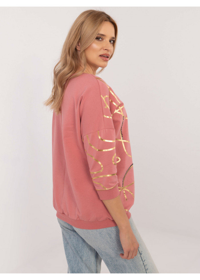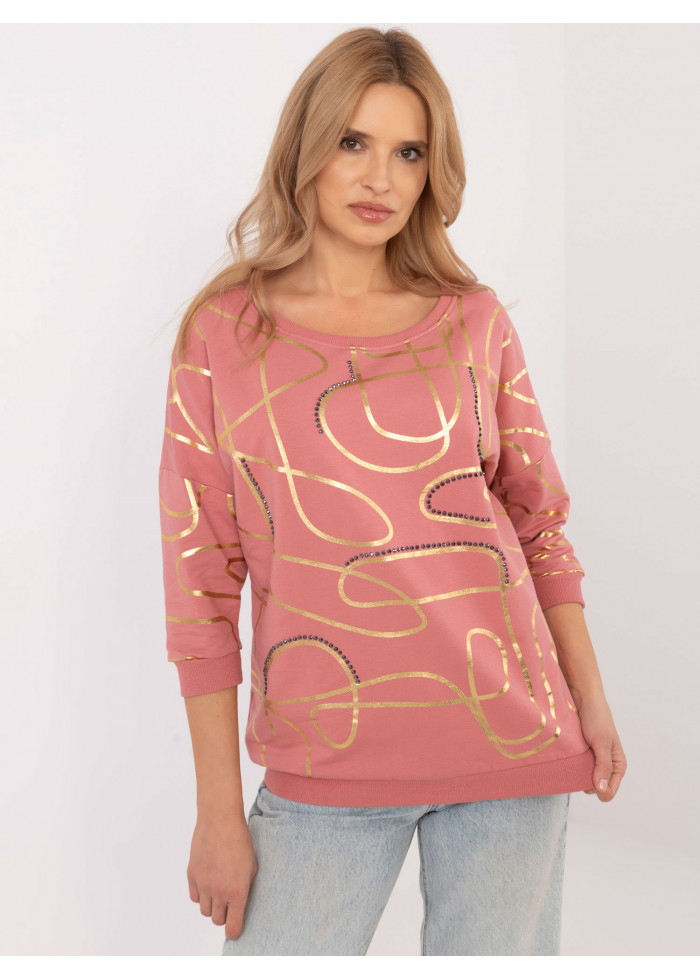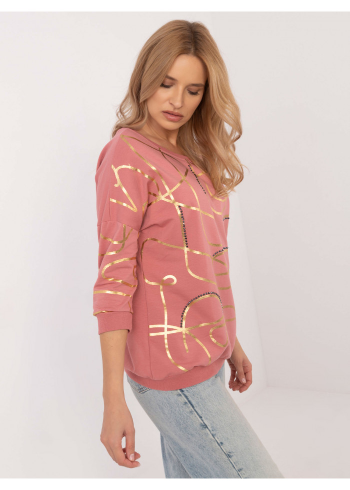 Dámska mikina, mikina s okrúhlym výstrihom, 3/4 rukávy s lémom, zlatá potlač na prednej strane, pás na chrbte, lém na spodnej časti, modelka má na sebe veľkosť s, miery modelky: výška 175 cm, prsia 90 cm, pás 66 cm, boky 94 cm, rozmer produktu meraného na plocho, vo veľkosti s:, šírka v podpazuší - 64 cm, dĺžka blúzky - 68 cm, dĺžka rukáva - 28 cm (od švu).