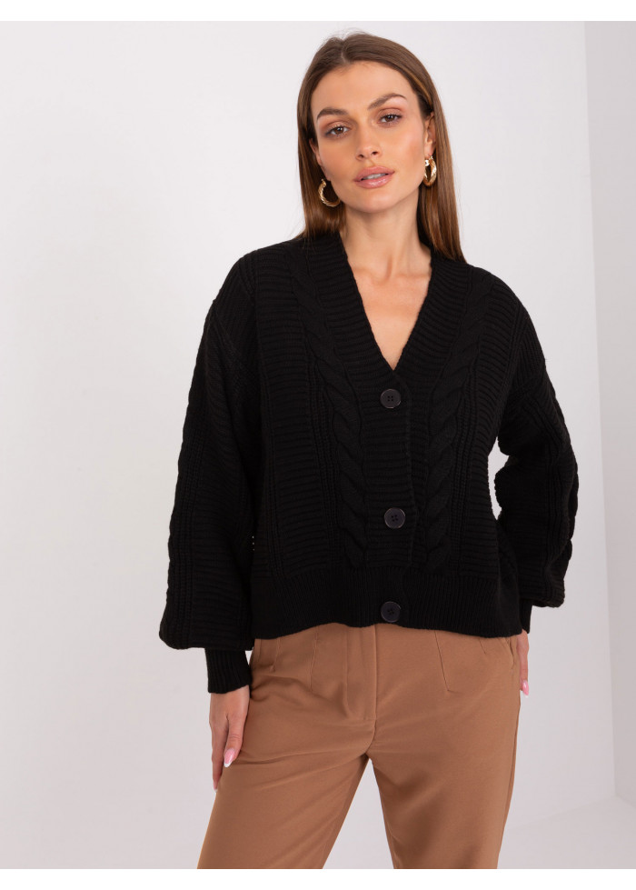 Dámsky pletený sveter, zapínanie na gombíky, výstrih do v, vysoké náplety na rukávoch, univerzálna veľkosť, miery modelky: výška 170 cm, prsia 93 cm, pás 66 cm, boky 93 cm., rozmer produktu meraného na plocho:, šírka pod plecami: 62 cm, dĺžka rukáva: 58 cm, celková dĺžka: 52 cm.