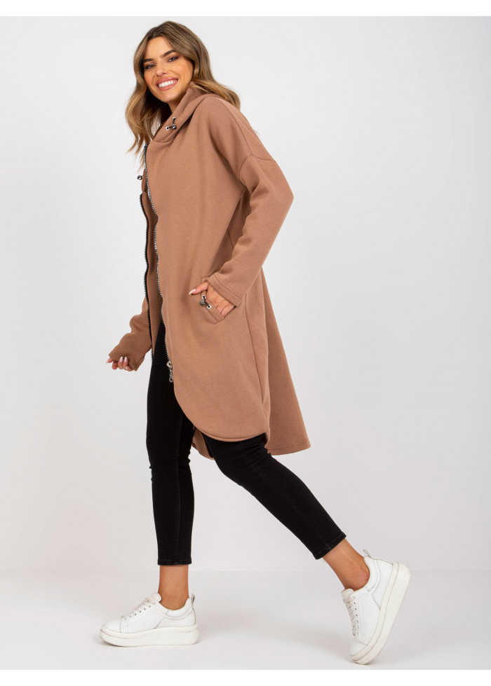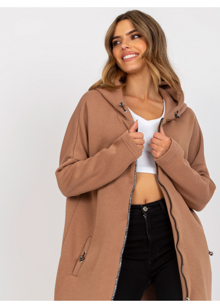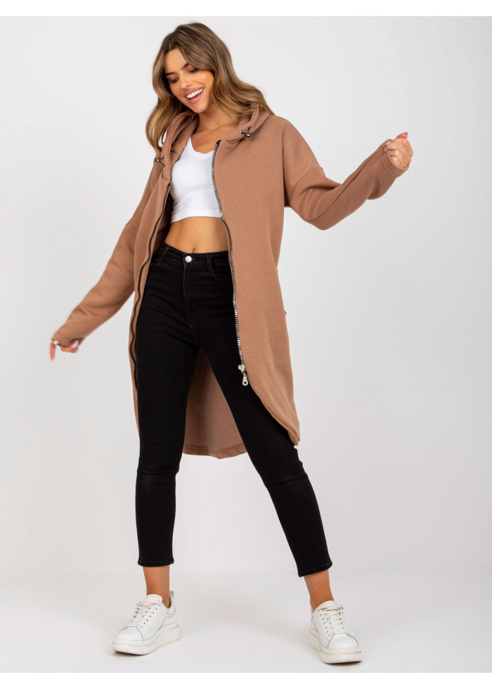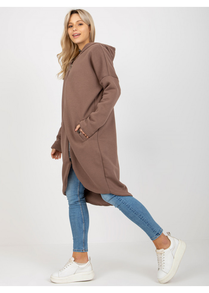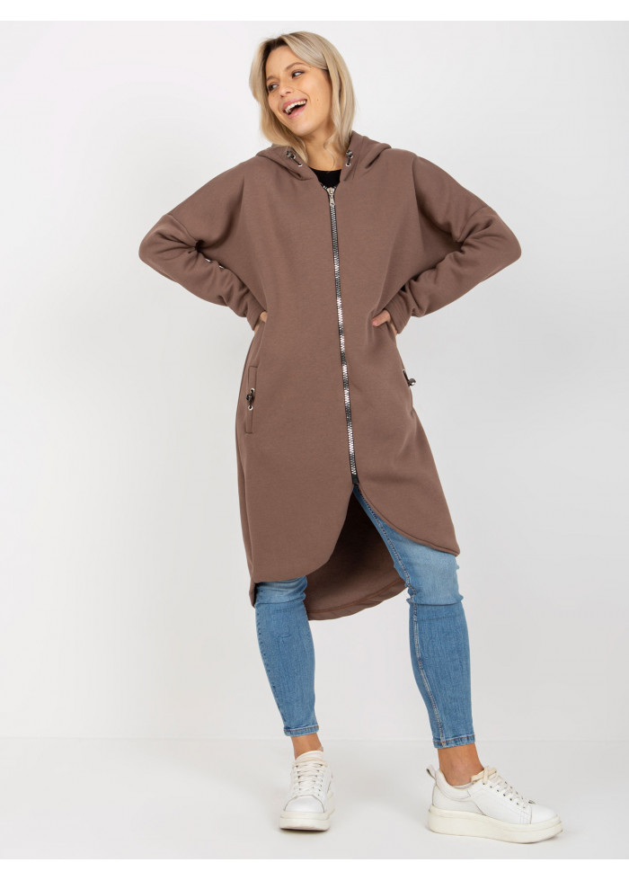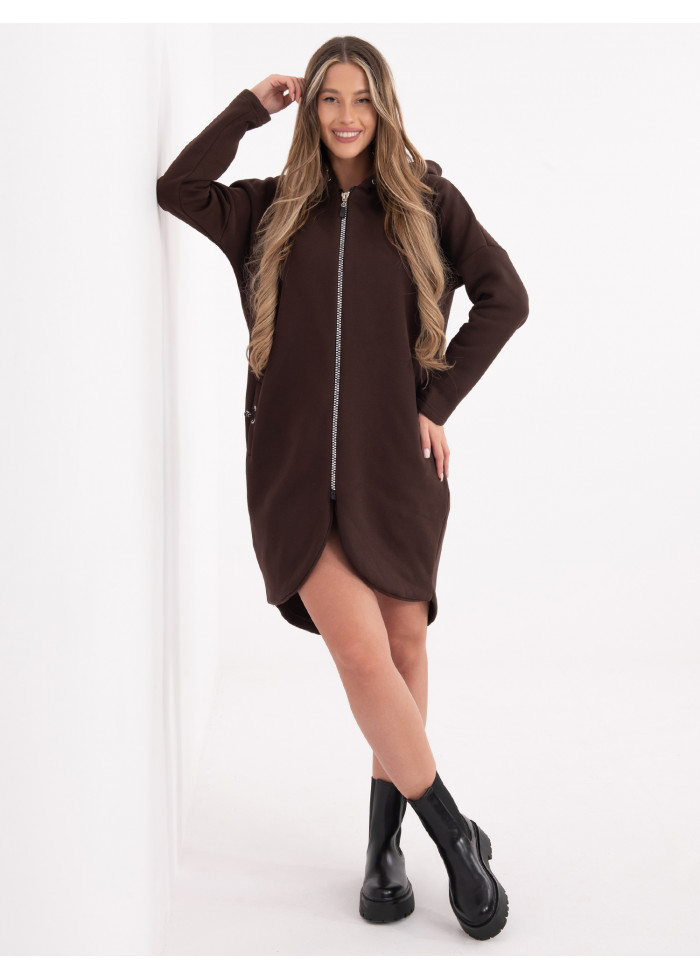 Predĺžená mikina s kapucňou, sťahujúca gumička na kapucni, zapínanie na zips, 2 vrecká, sťahujúce gumičky na vreckách, asymetrický strih, spôsob prania: pranie v práčke na 30°c, materiál: 90% bavlna, 10% elastan, modelka má na sebe veľkosť s/m, miery modelky: výška 162 cm, prsia 80 cm, pás 63 cm, boky 80 cm., rozmer produktu meraného na plocho, vo veľkosti s/m:, šírka pod plecami: 63 cm, celková dĺžka: 98 cm, dĺžka rukávov: 61 cm.