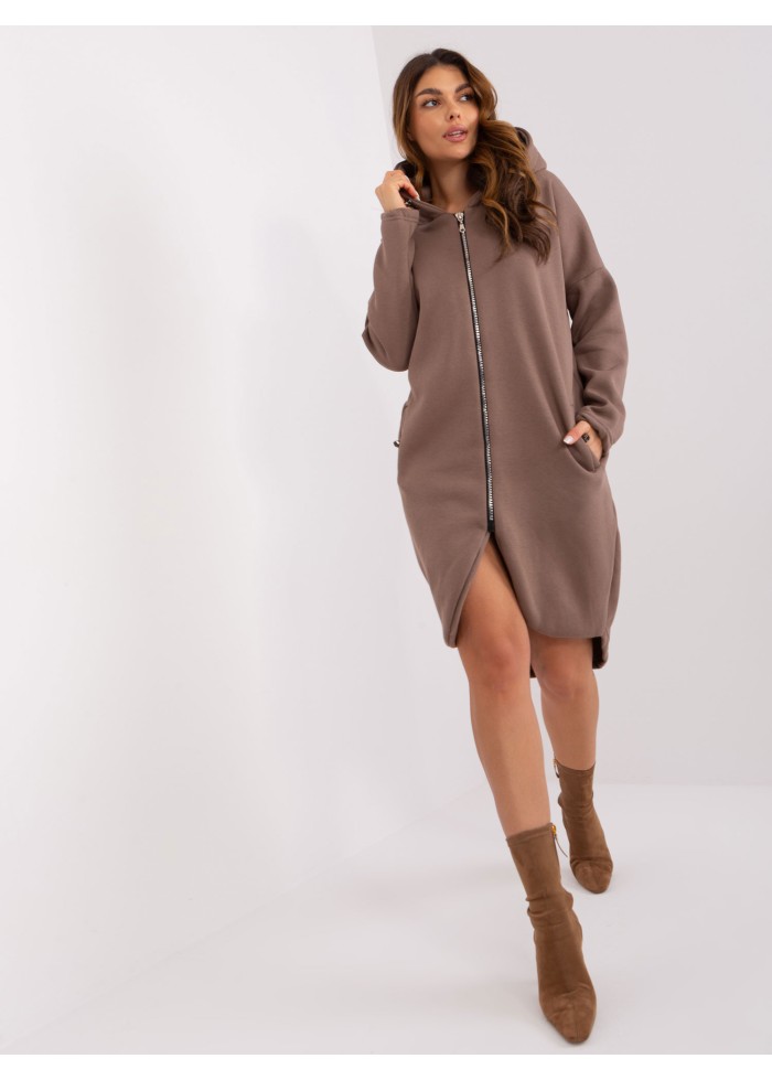 Dámska predĺžená mikina, dlhá mikina s kapucňou, zapínanie na zips, 2 vrecká, asymetrický strih, modelka má na sebe veľkosť s/m, miery modelky: výška: 168 cm, prsia: 82 cm, pás: 62 cm, boky: 93 cm, rozmer produktu meraného na plocho, vo veľkosti s/m:, šírka pod plecami: 66 cm, dĺžka rukáva: 61 cm, celková dĺžka: vpredu: 88 cm, vzadu: 99 cm.