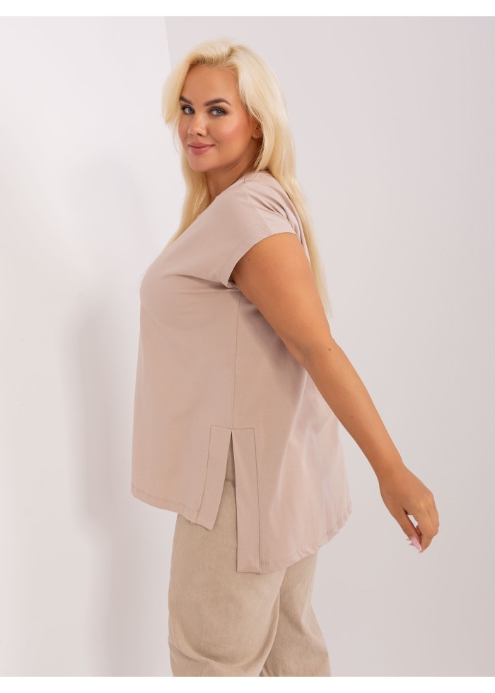 Bavlnené dámske tričko, okrúhly výstrih, krátky rukáv, rozparky po bokoch, asymetrický strih, univerzálna veľkosť, miery modelky: výška 172 cm, prsia 103 cm, pás 73 cm, boky 103 cm., rozmer produktu meraného na plocho:, šírka pod plecami: 60 cm, celková dĺžka: vpredu: 68 cm, vzadu: 77 cm.