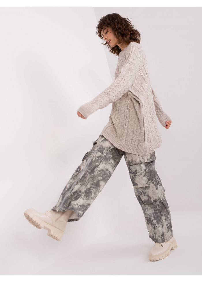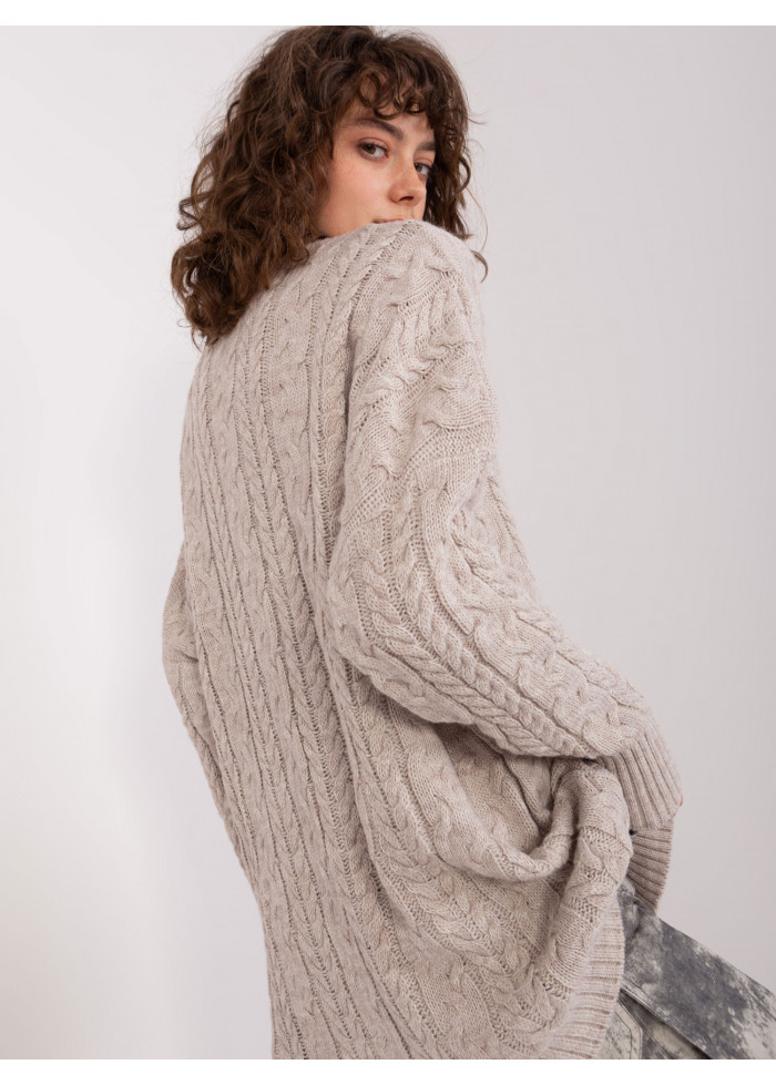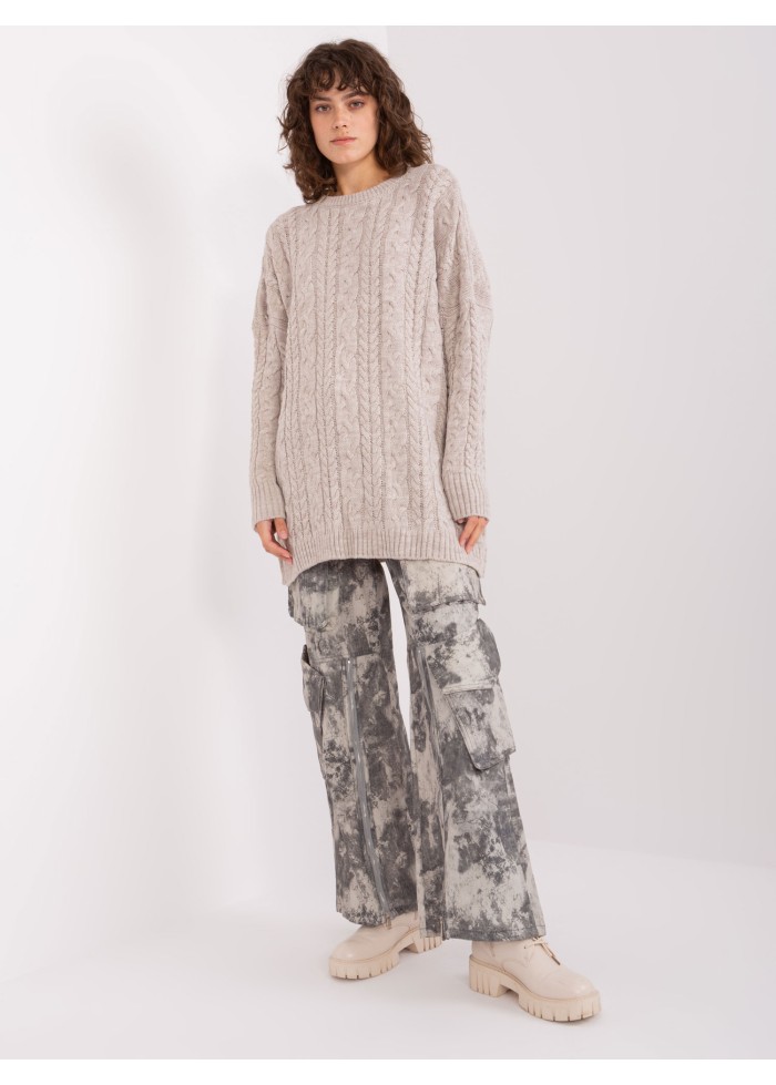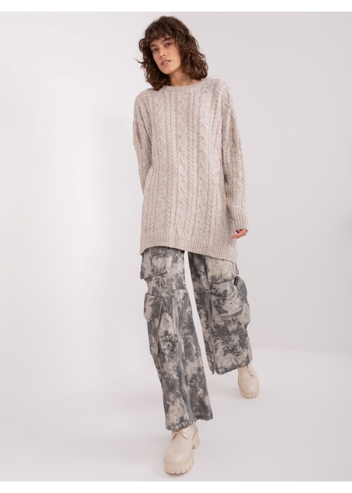 Predĺžený pulóver, pletený vzor, oversize strih, okrúhly výstrih, univerzálna veľkosť, miery modelky: výška: 178 cm, prsia: 80 cm, pás: 58 cm, boky: 88 cm, rozmer produktu meraného na plocho:, šírka pod plecami: 70 cm, dĺžka rukáva: 62 cm, celková dĺžka: 76 cm.