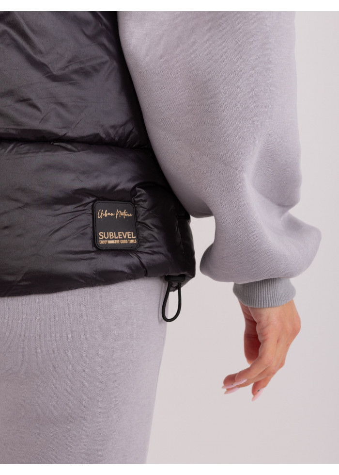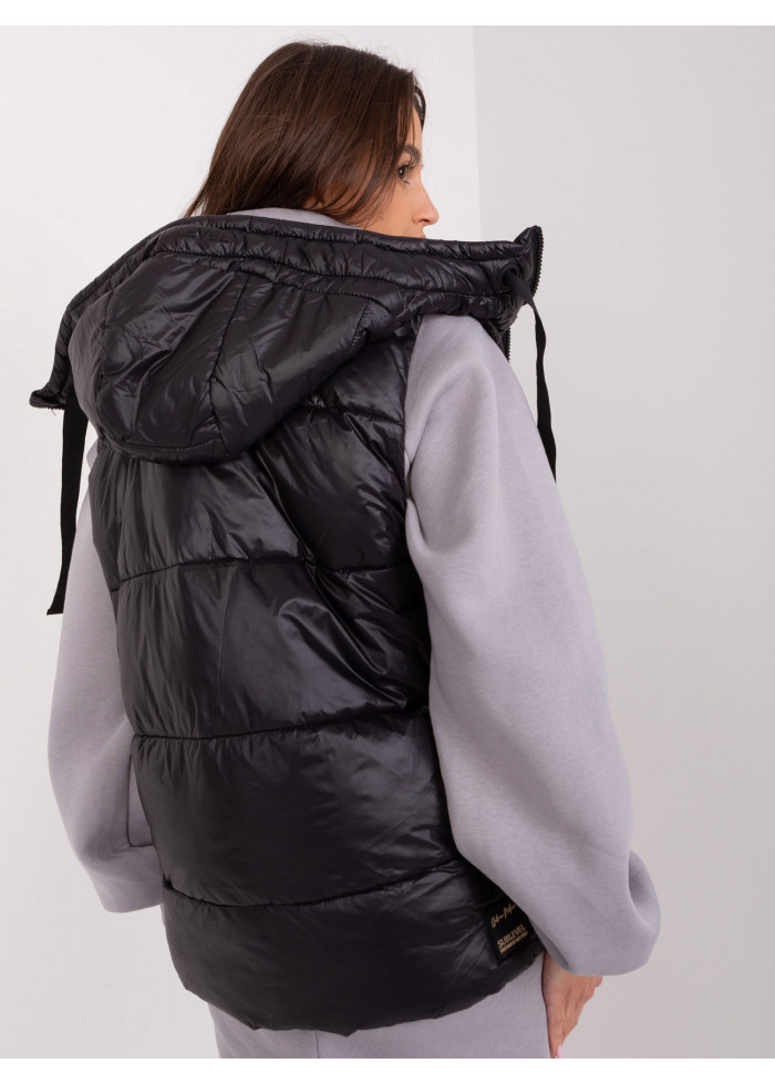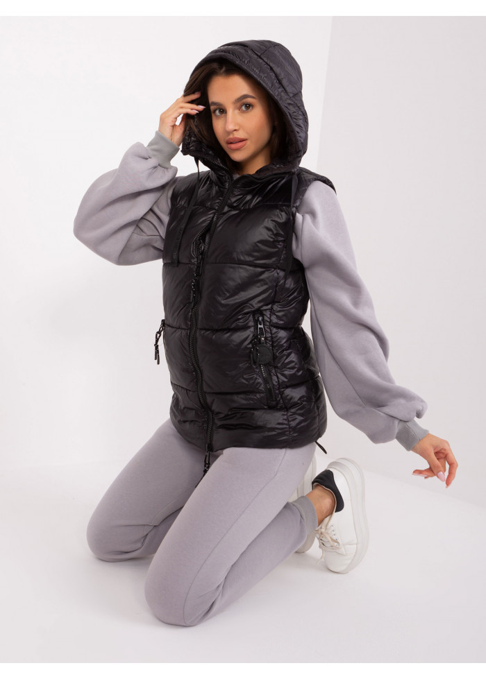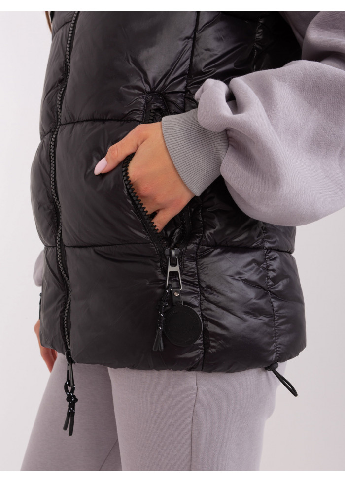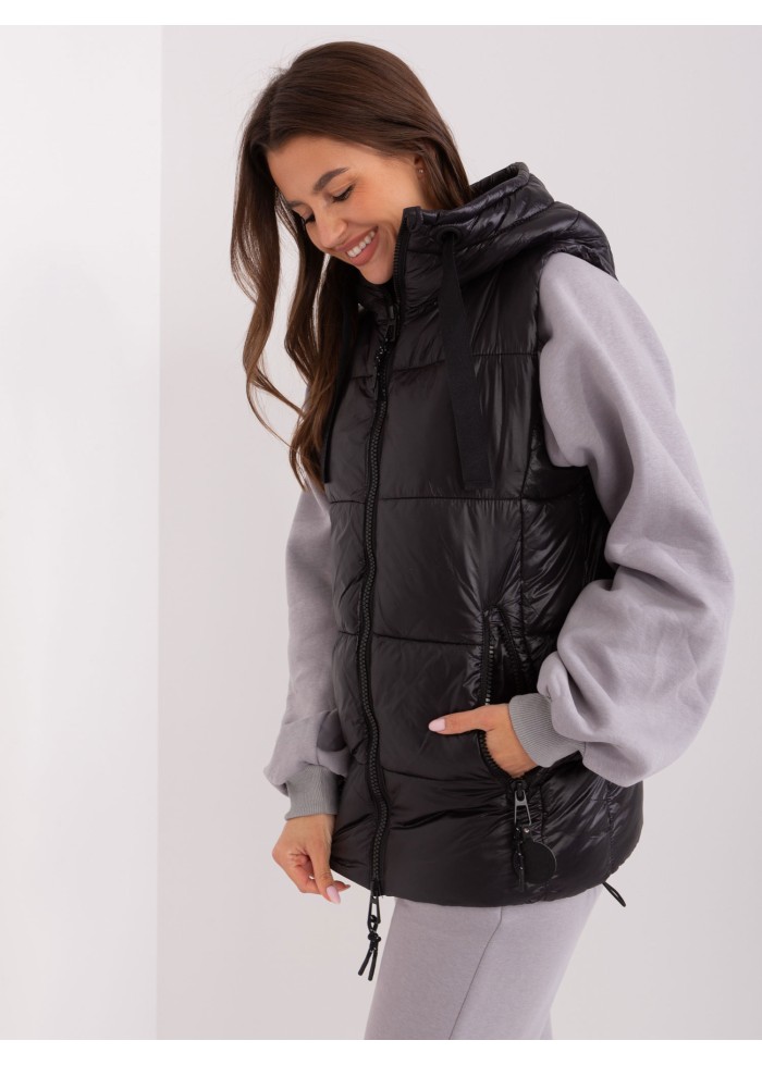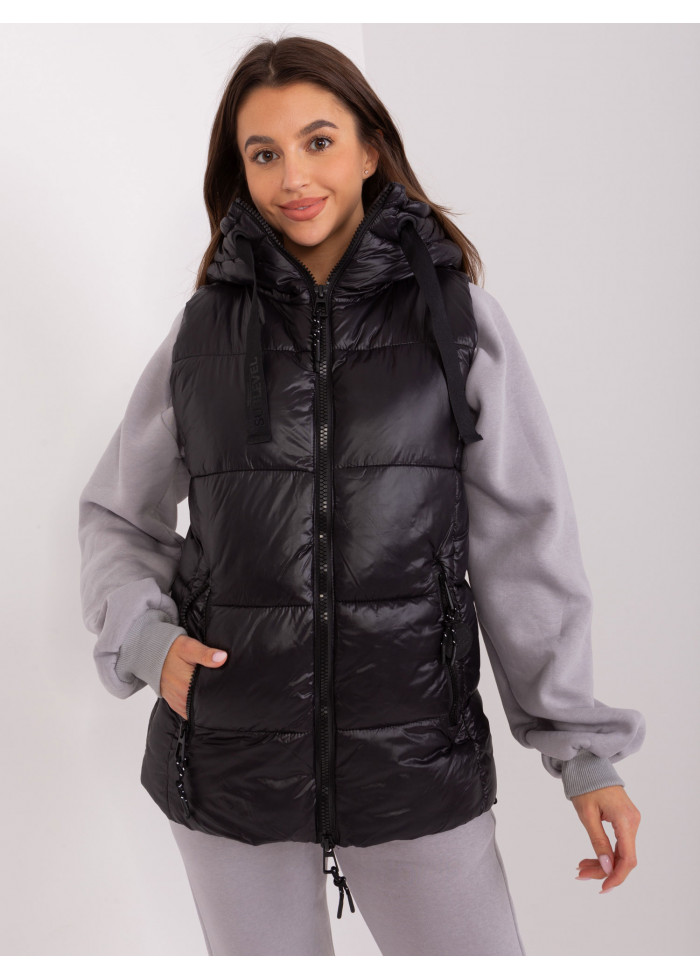 Dámska prešívaná vesta s kapucňou, ozdobné šnúrky na kapucni, zapínanie na zips, 2 vrecká na zips, sťahujúca gumička v spodnej časti, ozdobné aplikácie, modelka má na sebe veľkosť s, miery modelky: výška: 172 cm, prsia: 88 cm, pás: 63 cm, boky: 92 cm, rozmer produktu meraného na plocho, vo veľkosti s:, šírka pod plecami: 53 cm, celková dĺžka: 67 cm.