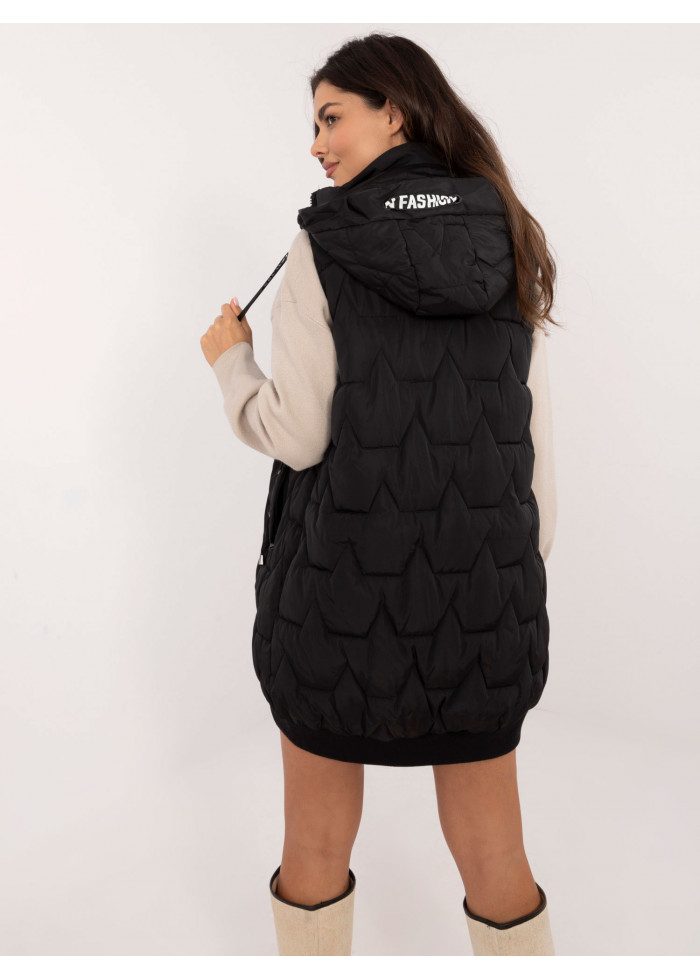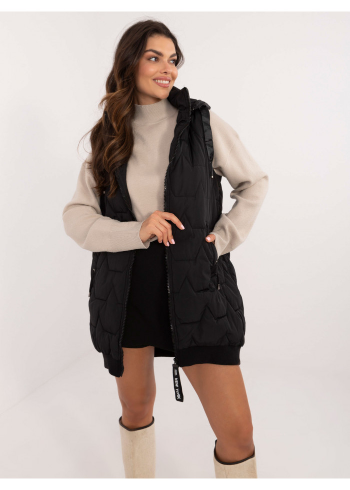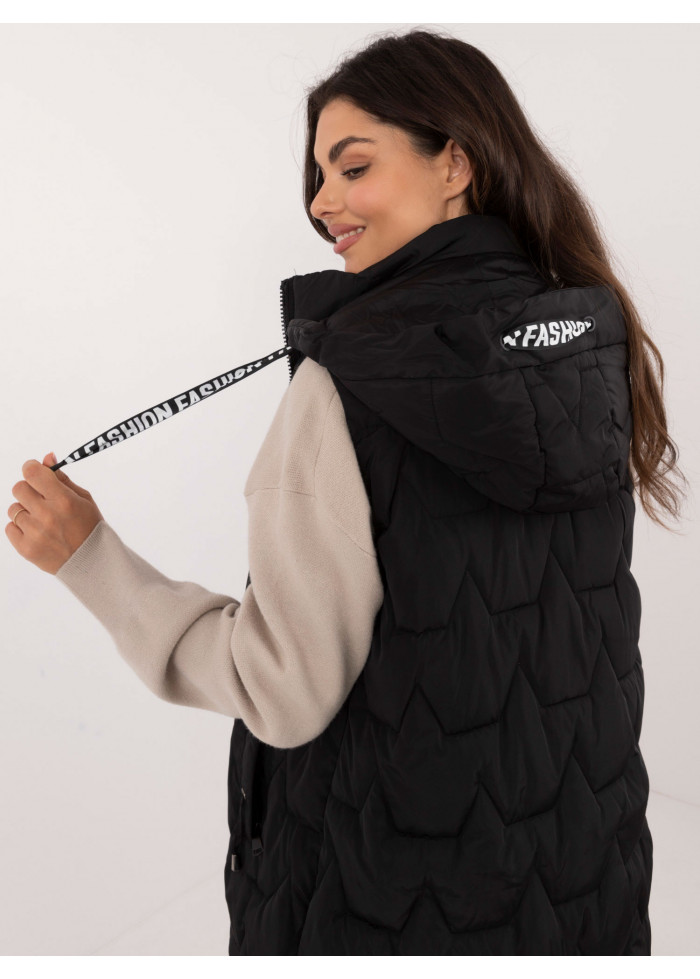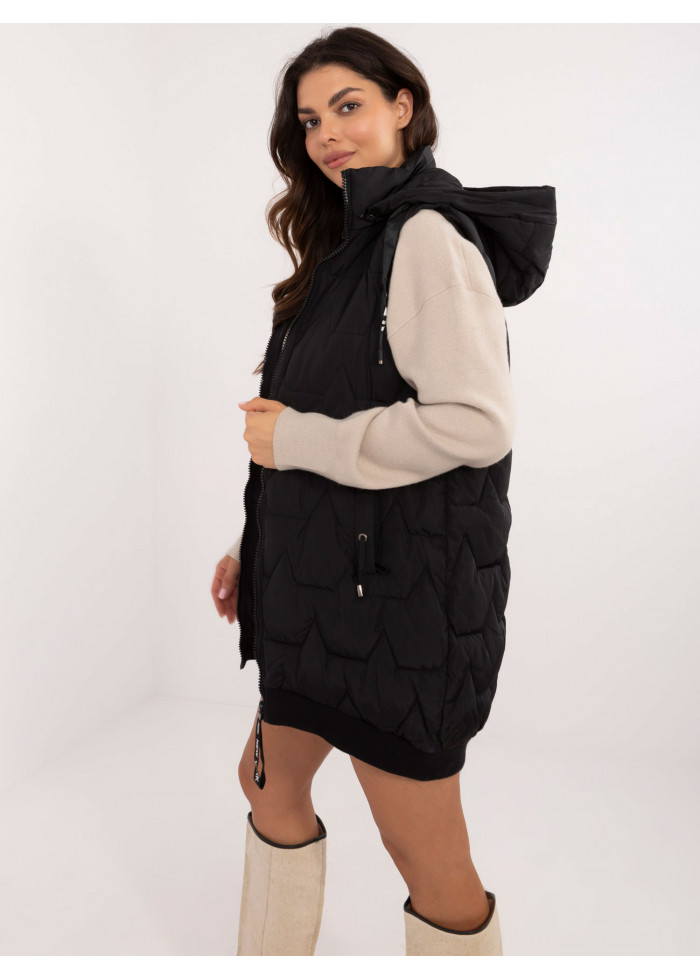 Dámska prešívaná vesta s kapucňou, kontrastné šnúrky na kapucni, zapínanie na zips, asymetrická zadná časť, 2 bočné vrecká, ozdobné šnúrky na vreckách, lém v spodnej časti, modelka má na sebe veľkosť s, miery modelky: výška 173 cm, prsia 85 cm, pás 62 cm, boky 95 cm, rozmer produktu meraného na plocho, vo veľkosti s:, šírka pod pazuchami - 51 cm, celková dĺžka - 81 cm.