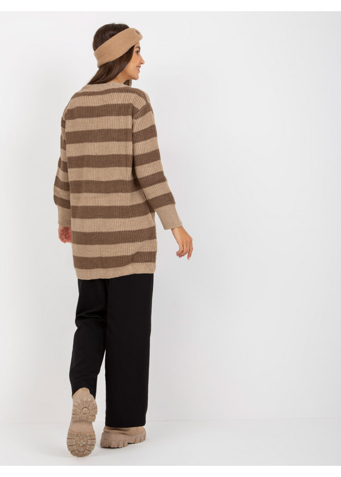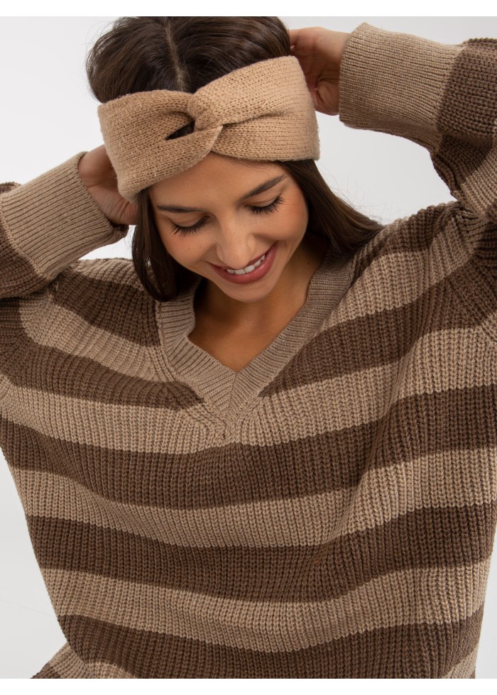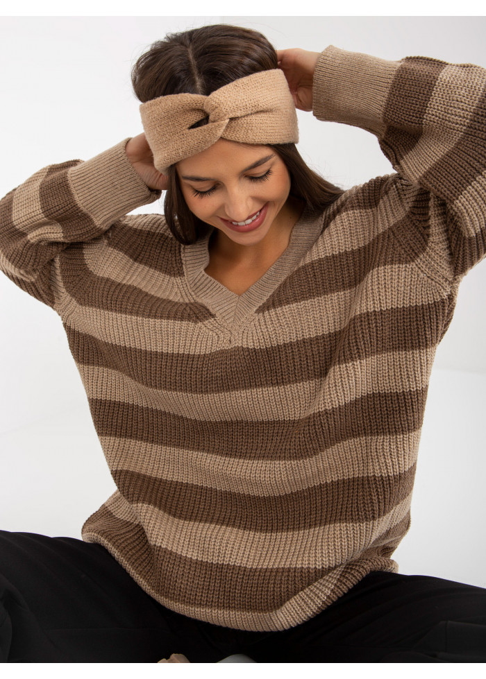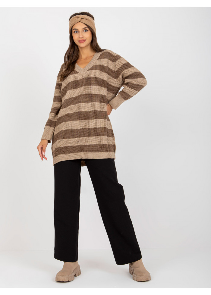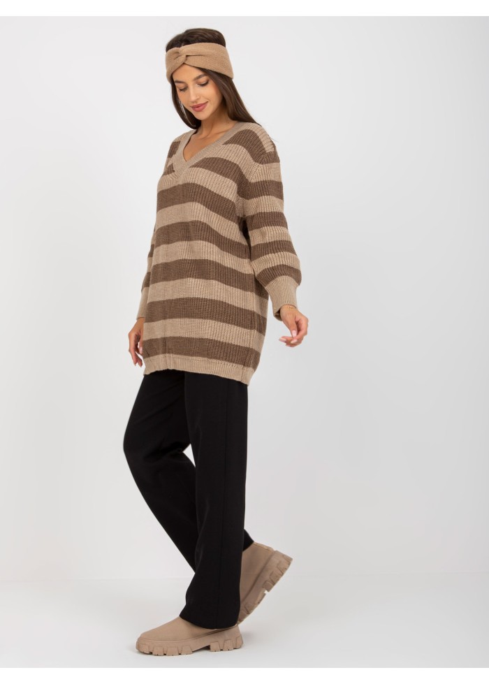 Dámsky pruhovaný sveter, výrazný výstrih do v, mierne rozširujúci sa strih, spôsob prania: pranie v práčke na 30°c, materiál: 70% akryl, 30% vlna, univerzálna veľkosť, miery modelky: výška: 172 cm, prsia: 88 cm, pás: 63 cm, boky: 92 cm, rozmer produktu meraného na plocho:, šírka pod plecami: 56 cm, dĺžka rukáva: 52 cm, celková dĺžka: 71 cm.
