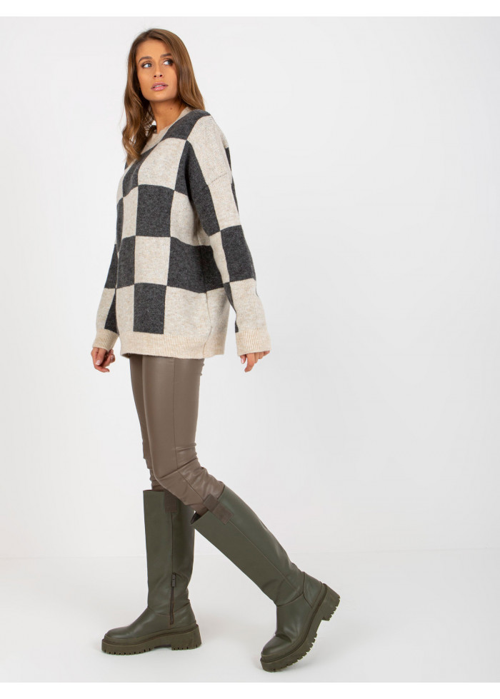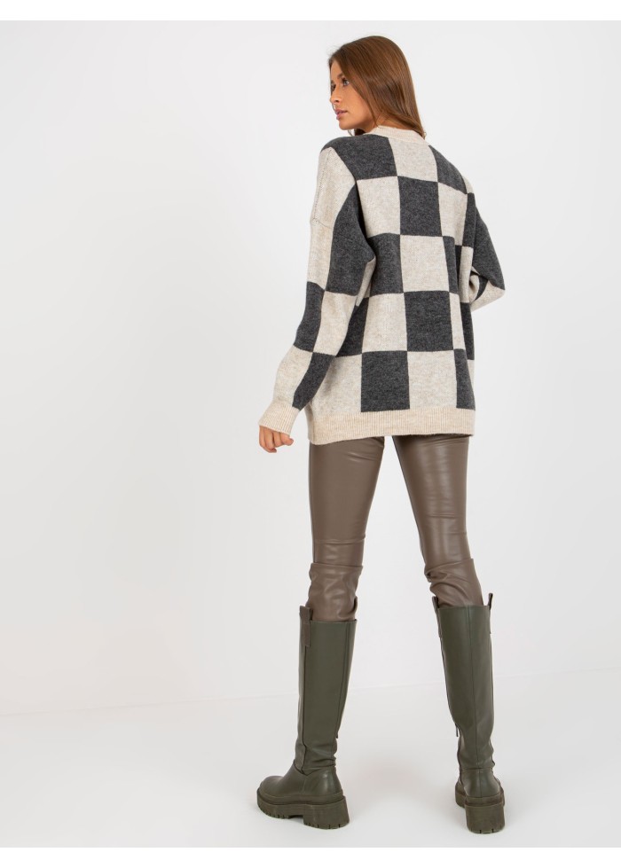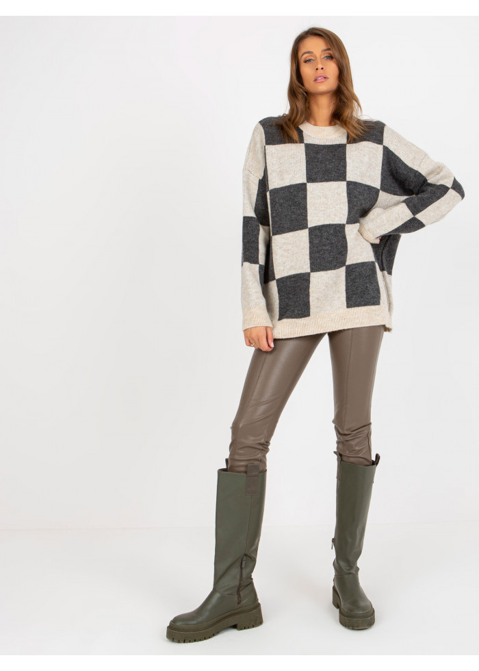 Dámsky pulóver z jemného úpletu, šachovnicový vzor, okrúhly výstrih, jemné sťahujúce lémy na koncoch rukávov a v spodnej časti, voľnejší strih, spôsob prania: pranie v práčke na 30°c, materiál: 90% bavlna, 10% polyester, univerzálna veľkosť, miery modelky: výška 176 cm, prsia 85 cm, pás: 64 cm, boky: 92 cm, rozmer produktu meraného na plocho:, šírka pod plecami: 69 cm, dĺžka rukáva: 62 cm, celková dĺžka: 72 cm.