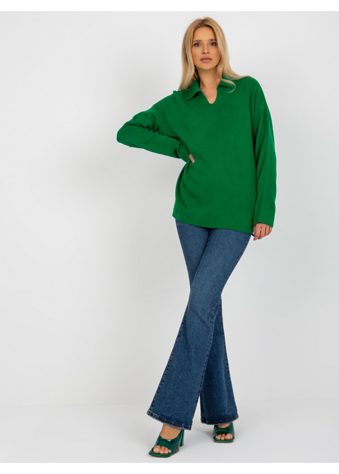 Dámsky pulóver z jemného úpletu, dekolt s golierom, výstrih do v, dlhé rukávy, jednoduchý strih, univerzálna veľkosť, miery modelky: výška 175 cm, prsia 84 cm, pás 65 cm, boky 92 cm., rozmer produktu meraného na plocho:, šírka pod plecami: 65 cm, dĺžka rukáva: 60 cm, celková dĺžka: 71 cm.