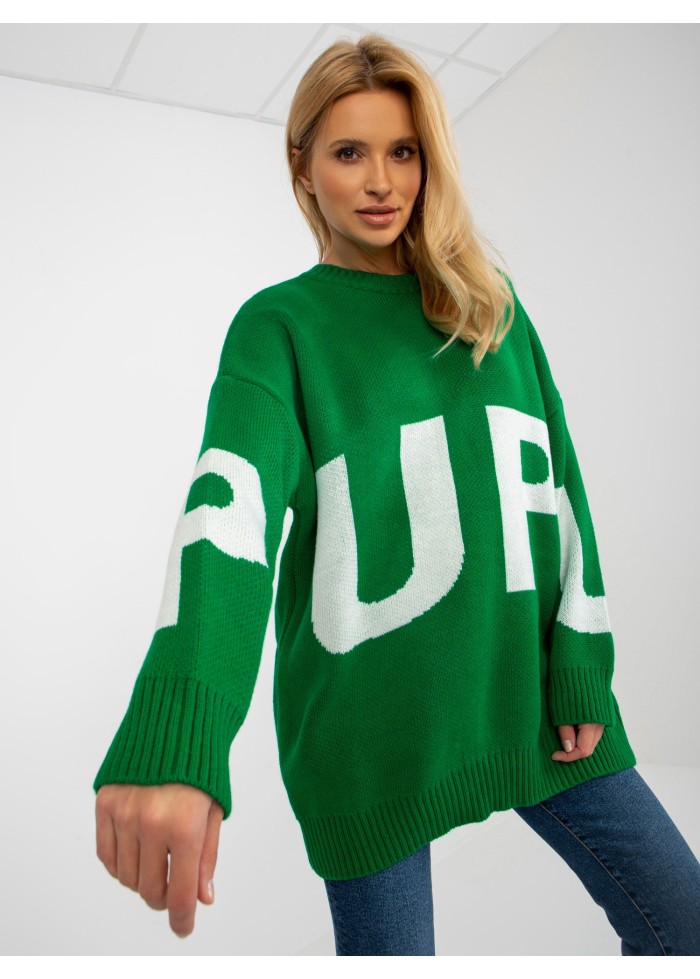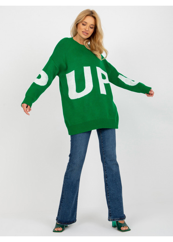 Dámsky pulóver z jemného úpletu, okrúhly výstrih, ozdobný nápis, lémy na koncoch rukávov a v spodnej časti, univerzálna veľkosť, miery modelky: výška 175 cm, prsia 84 cm, pás 65 cm, boky 92 cm., rozmer produktu meraného na plocho:, šírka pod plecami: 67 cm, dĺžka rukáva: 61 cm, celková dĺžka: 81 cm.