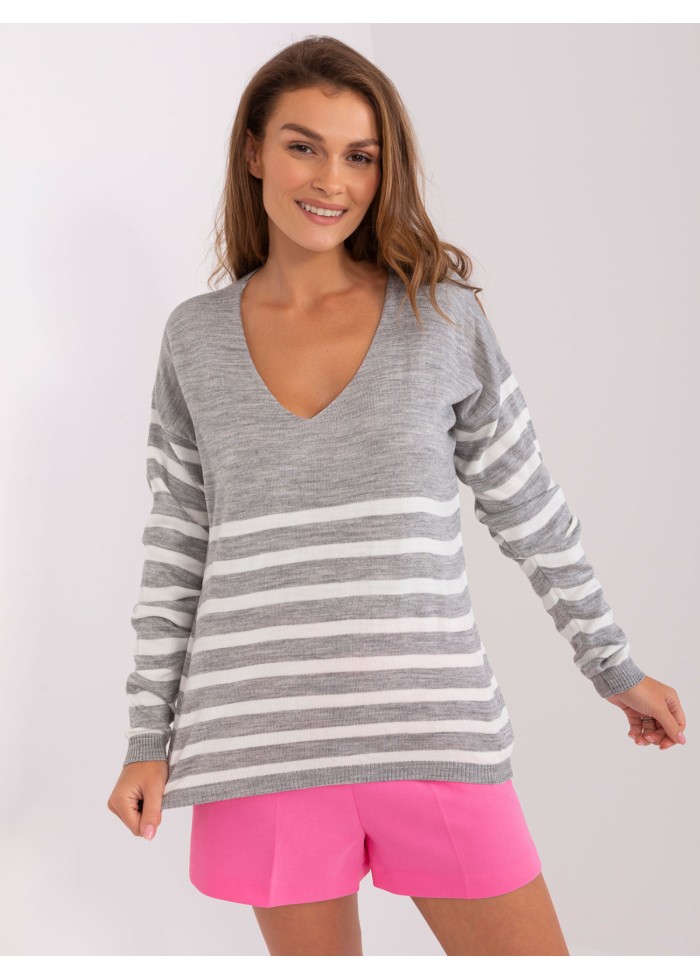 Dámsky pulóver z jemného úpletu, výrazný výstrih do v, pruhovaný dizajn, univerzálna veľkosť, miery modelky: výška 175 cm, prsia 84 cm, pás 65 cm, boky 92 cm., rozmer produktu meraného na plocho:, šírka pod plecami: 64 cm, dĺžka rukáva: 65 cm, celková dĺžka: 65 cm.