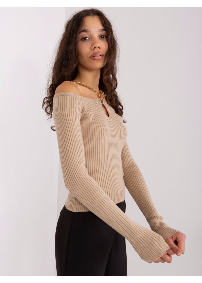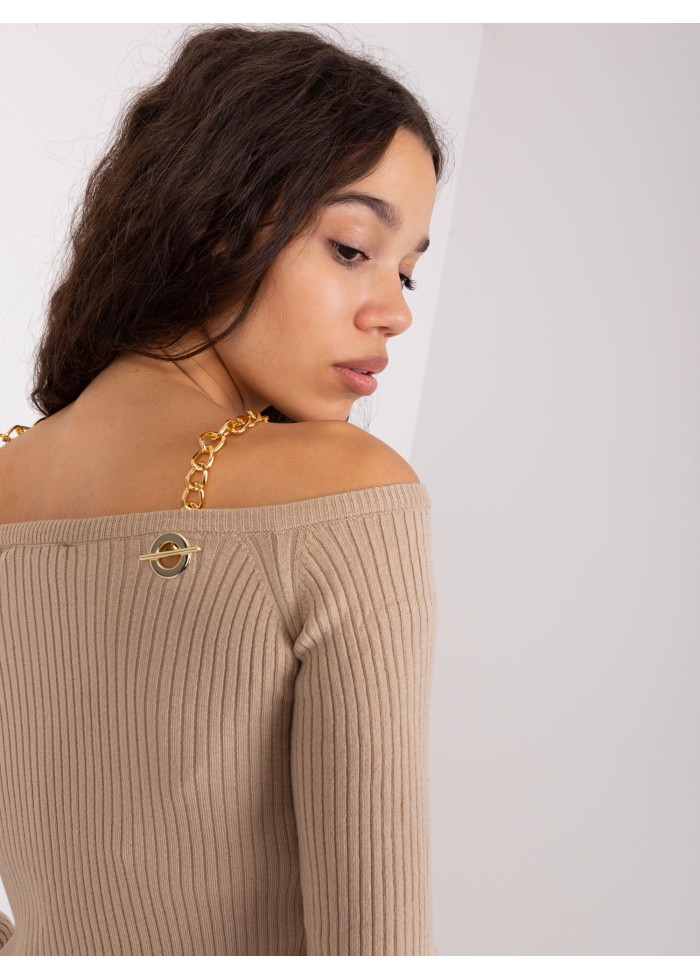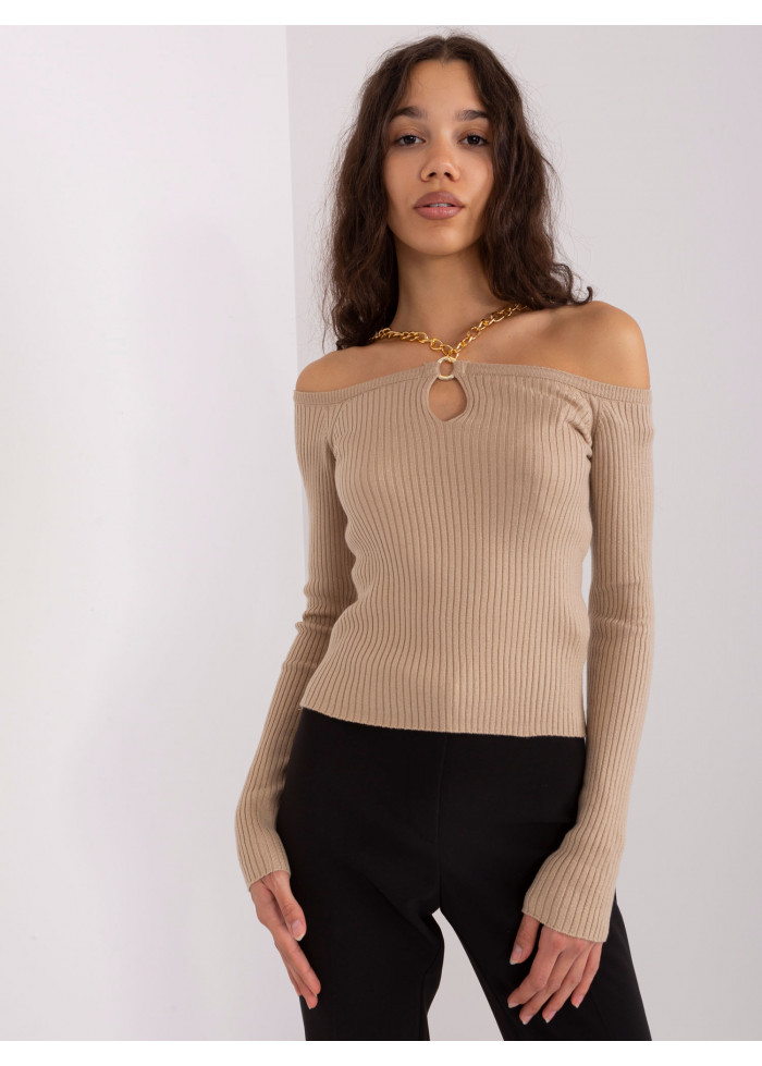 Dámsky pulóver, odkryté ramená, ozdobná retiazka vpredu, rebrovaný úplet, modelka má na sebe veľkosť s/m, miery modelky: výška: 178 cm, prsia: 80 cm, pás: 58 cm, boky: 88 cm, rozmer produktu meraného na plocho, vo veľkosti s/m:, šírka pod plecami: 45 cm, dĺžka rukáva: 60 cm, celková dĺžka: 46 cm.