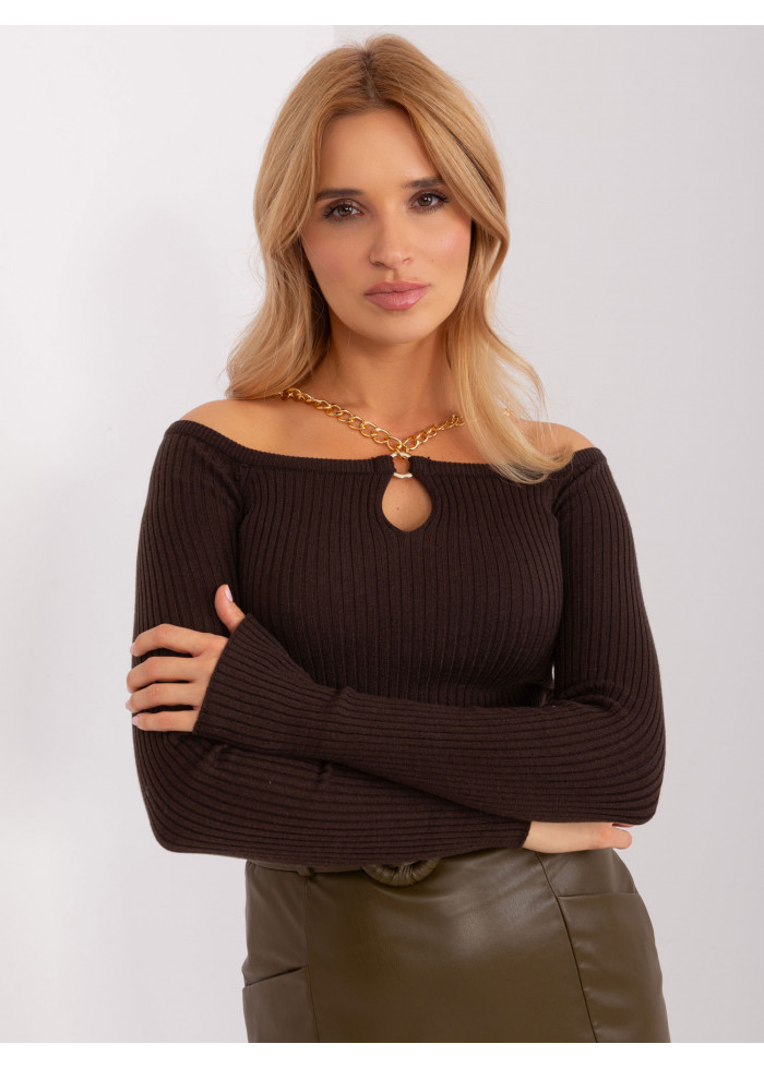 Dámsky pulóver, odkryté ramená, ozdobná retiazka vpredu, rebrovaný úplet, modelka má na sebe veľkosť s/m, miery modelky: výška: 178 cm, prsia: 80 cm, pás: 58 cm, boky: 88 cm, rozmer produktu meraného na plocho, vo veľkosti s/m:, šírka pod plecami: 45 cm, dĺžka rukáva: 60 cm, celková dĺžka: 46 cm.
