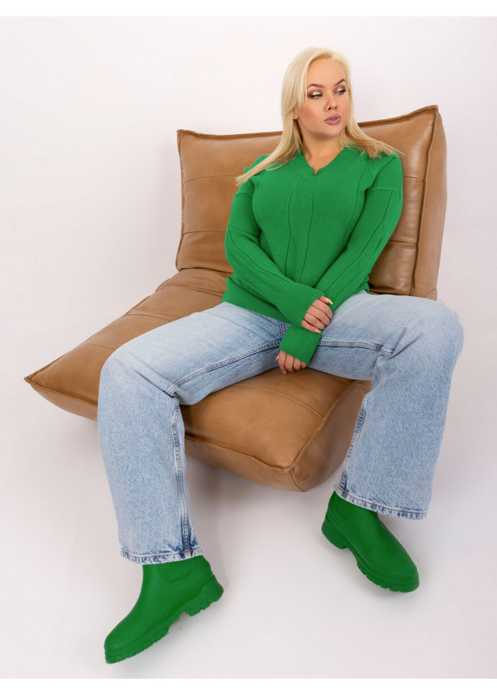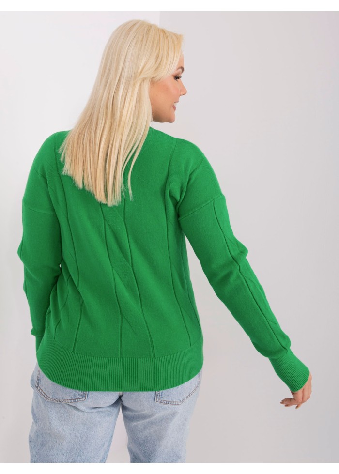 Dámsky pulóver z jemného úpletu, pletený vzor, výstrih do v, jemné sťahujúce lémy na koncoch rukávov a v spodnej časti, ozdobná aplikácia, modelka má na sebe veľkosť xl/xxl. miery modelky: výška: 172 cm, prsia: 103 cm, pás: 73 cm, boky: 103 cm, rozmer produktu meraného na plocho, vo veľkosti xl/xxl: šírka pod plecami: 54 cm, dĺžka rukáva: 62 cm, celková dĺžka: 61 cm.