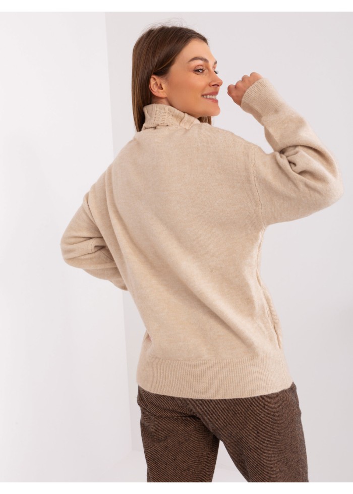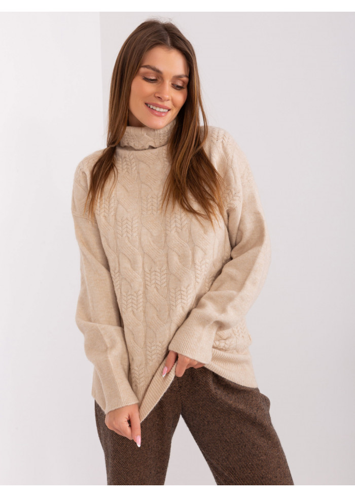 Dámsky pletený rolák, pletený vzor v prednej časti, lémy na konci rukávov, univerzálna veľkosť, miery modelky: výška 170 cm, prsia 93 cm, pás 66 cm, boky 93 cm., rozmer produktu meraného na plocho:, šírka pod plecami: 52 cm, dĺžka rukáva: 59 cm, celková dĺžka: 64 cm.