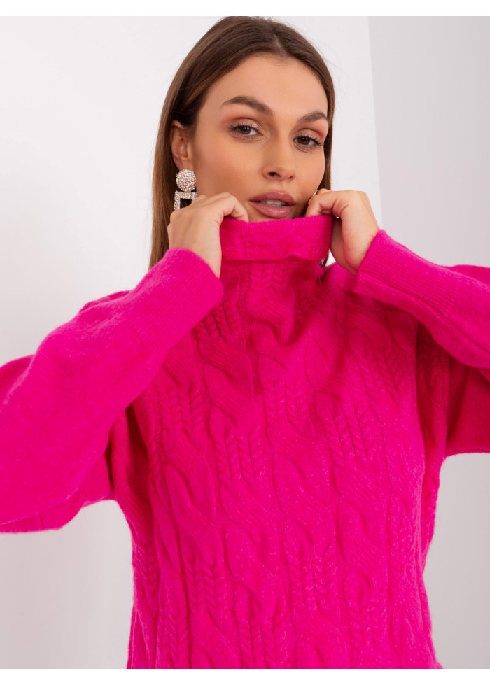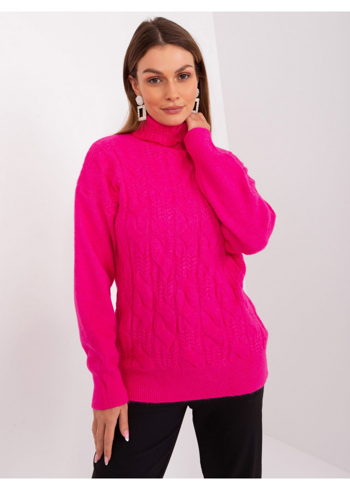 Dámsky pletený rolák, pletený vzor v prednej časti, lémy na konci rukávov, univerzálna veľkosť, miery modelky: výška 170 cm, prsia 93 cm, pás 66 cm, boky 93 cm., rozmer produktu meraného na plocho:, šírka pod plecami: 52 cm, dĺžka rukáva: 59 cm, celková dĺžka: 64 cm.
