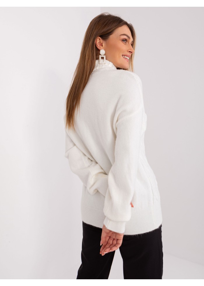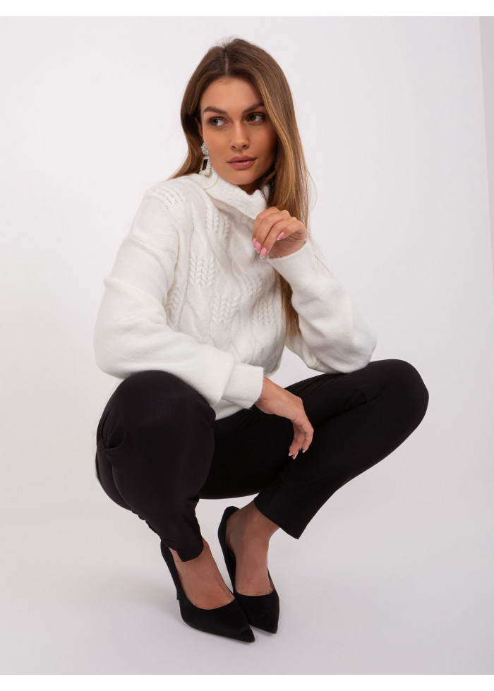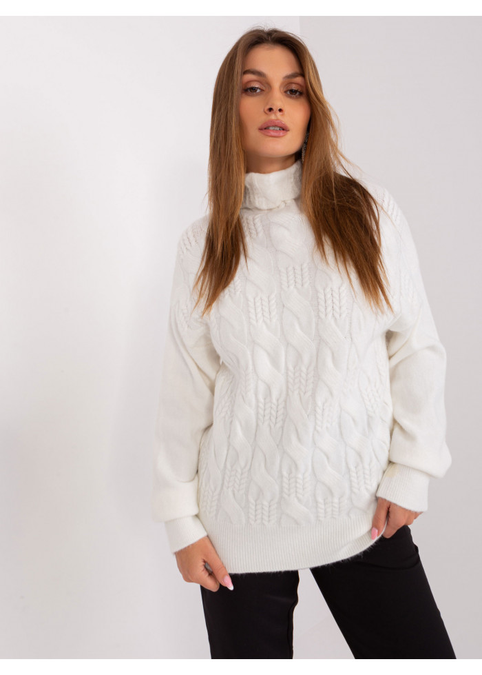 Dámsky pletený rolák, pletený vzor v prednej časti, lémy na konci rukávov, univerzálna veľkosť, miery modelky: výška 170 cm, prsia 93 cm, pás 66 cm, boky 93 cm., rozmer produktu meraného na plocho:, šírka pod plecami: 52 cm, dĺžka rukáva: 59 cm, celková dĺžka: 64 cm.