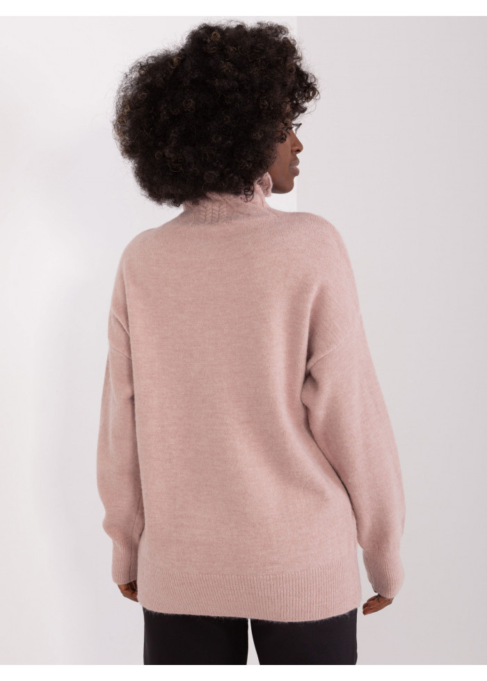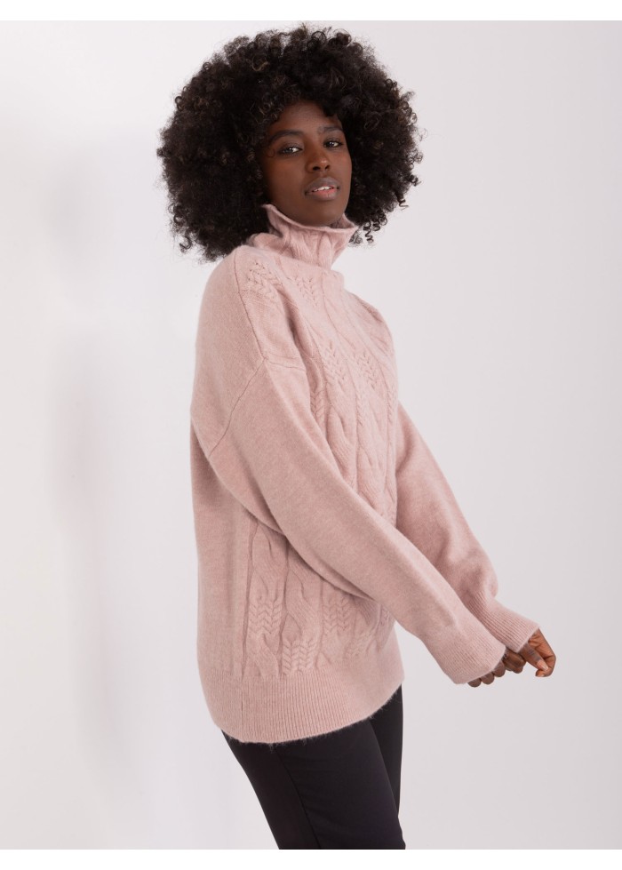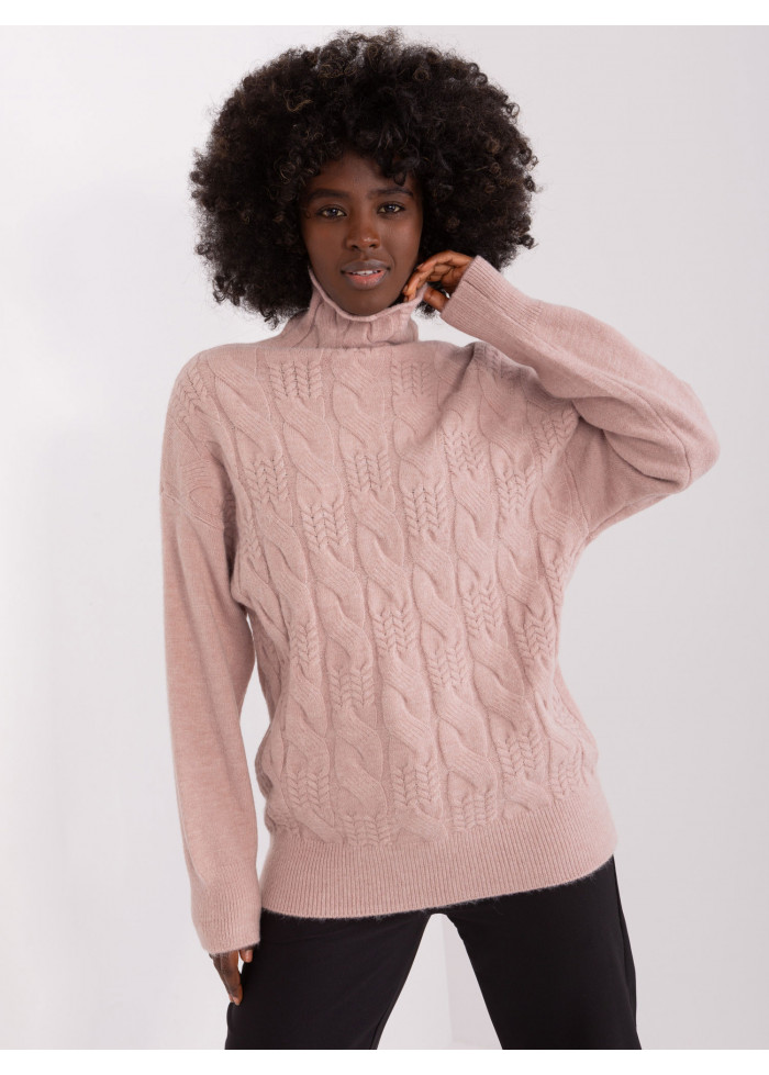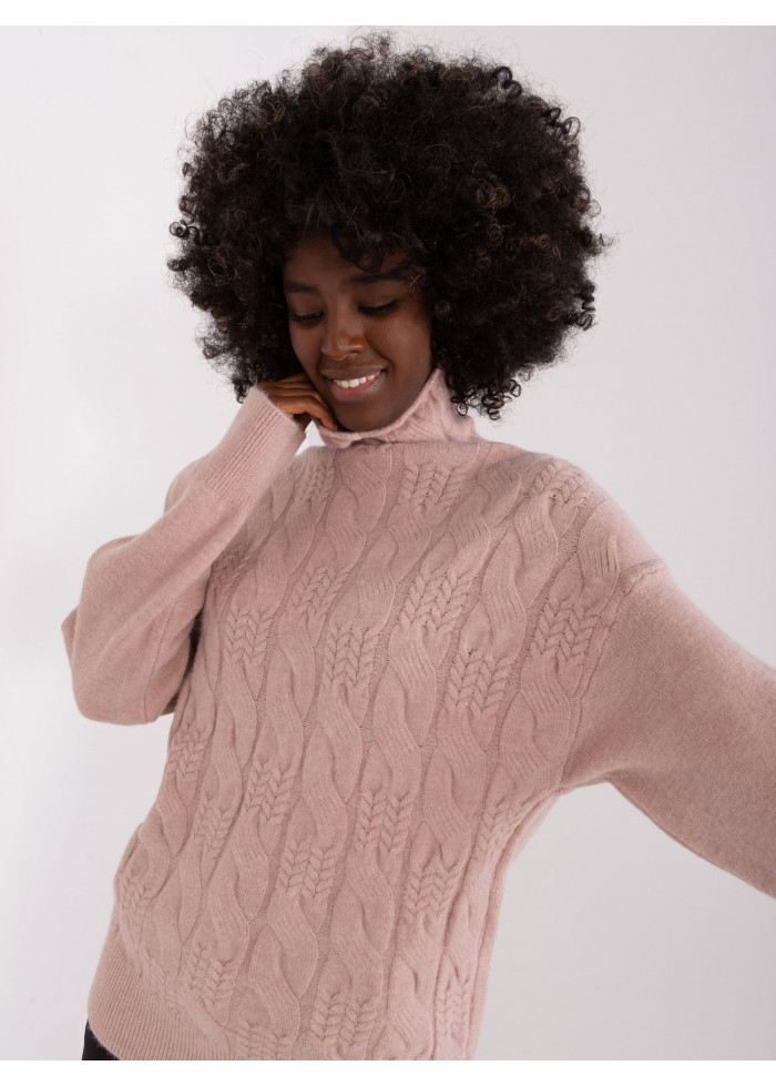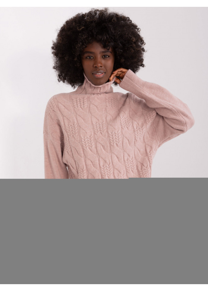 Dámsky pletený rolák, pletený vzor v prednej časti, lémy na konci rukávov, univerzálna veľkosť, miery modelky: výška 170 cm, prsia 93 cm, pás 66 cm, boky 93 cm., rozmer produktu meraného na plocho:, šírka pod plecami: 52 cm, dĺžka rukáva: 59 cm, celková dĺžka: 64 cm.