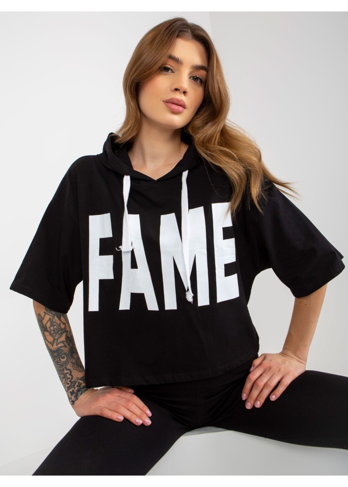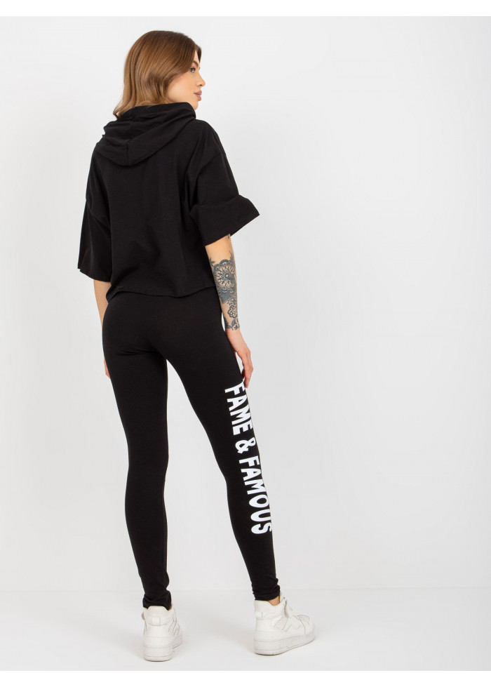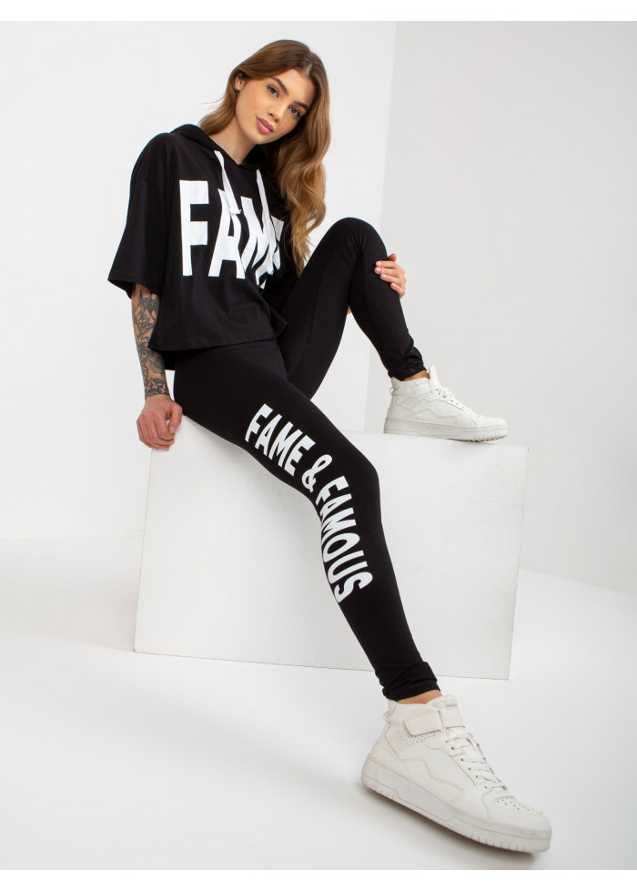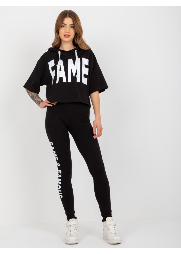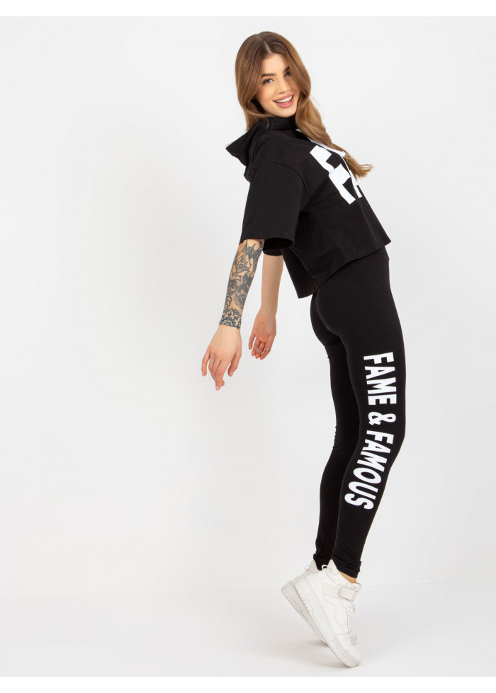Dámska súprava, tričko s kapucňou, kontrastné šnúrky na kapucni, ozdobná potlač, krátky rukáv, crop top strih, legíny s vysokým pásom, ozdobná potlač na nohavici, univerzálna veľkosť, miery modelky: výška: 173 cm, prsia: 78 cm, pás: 60 cm, boky: 90 cm, rozmer produktu meraného na plocho:, šírka pod plecami: 54 cm, dĺžka rukáva: 26 cm, celková dĺžka: 48 cm, šírka nohavíc v páse: 31 cm, výška sedu: 26 cm, celková dĺžka: 96 cm.