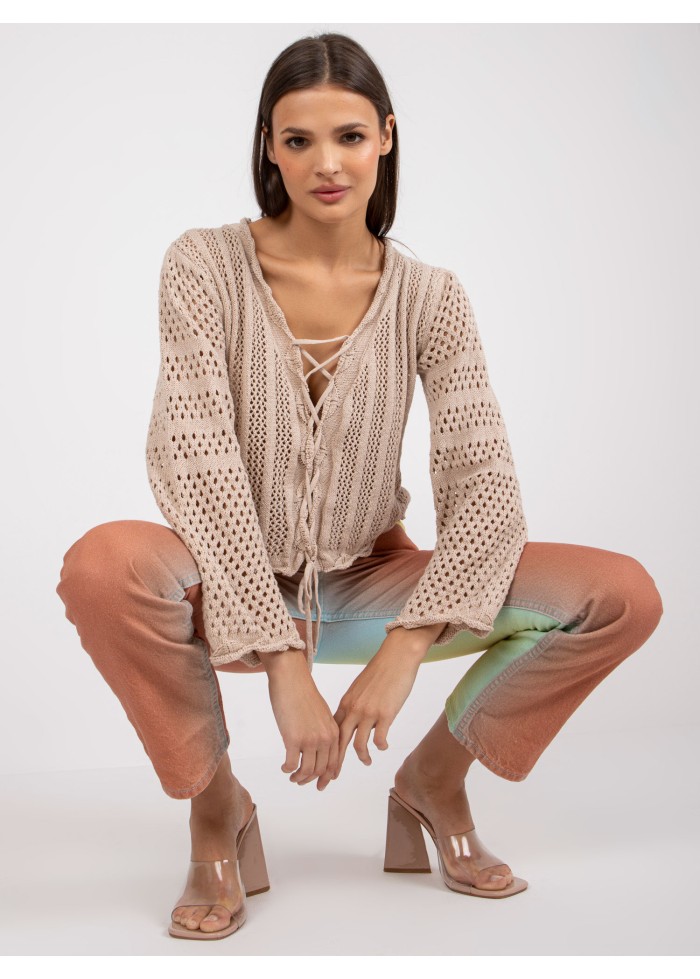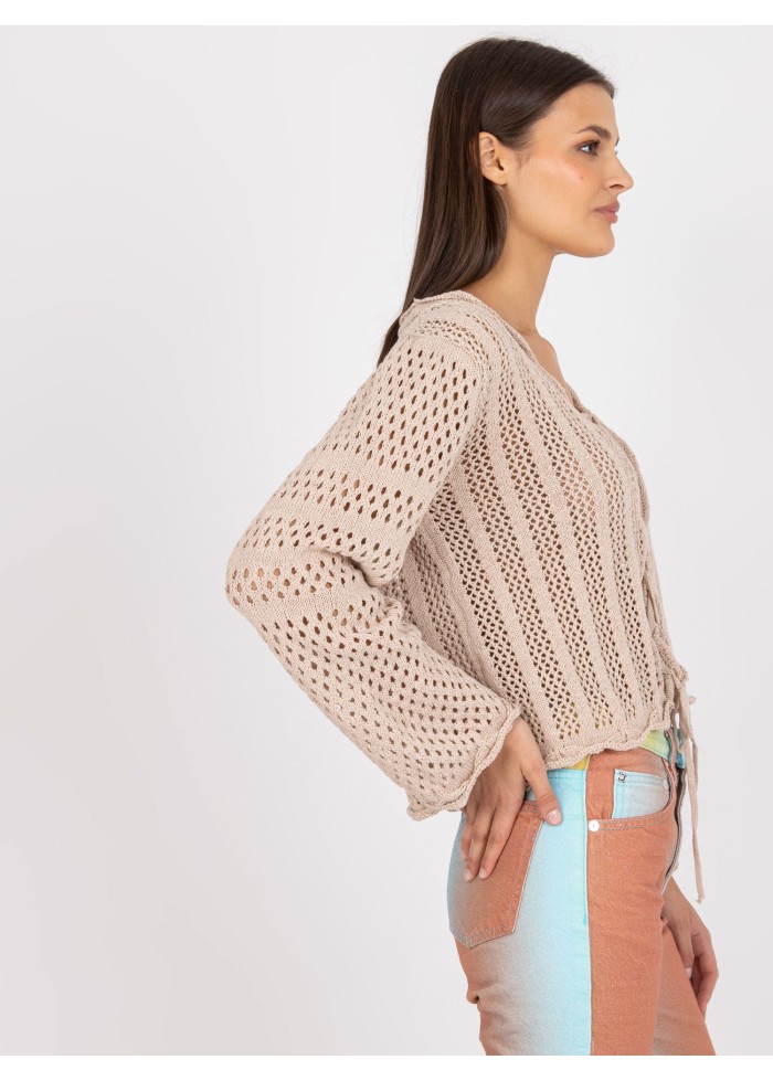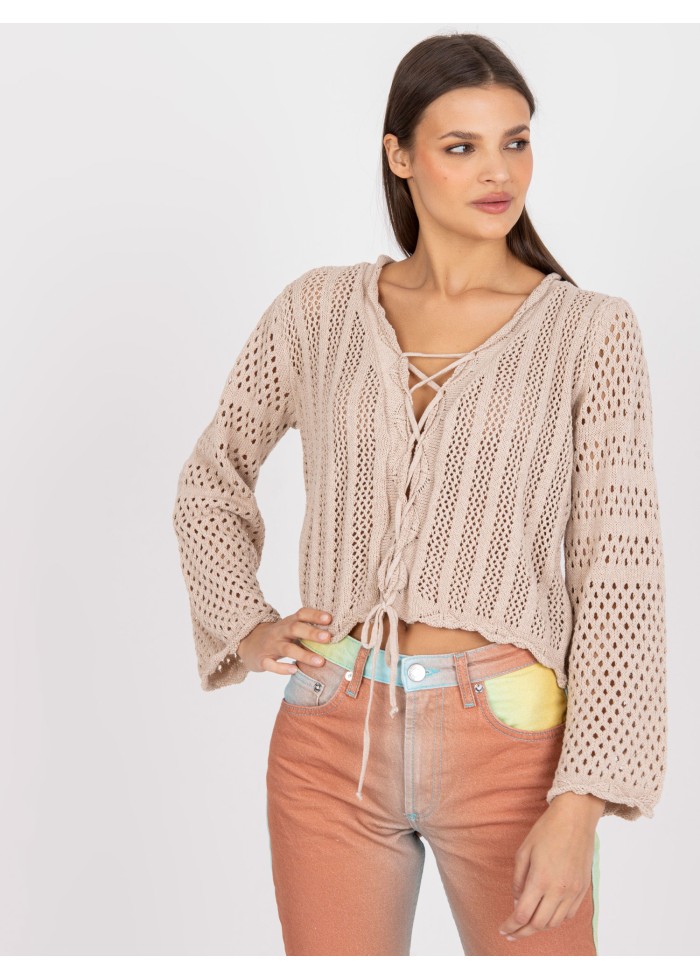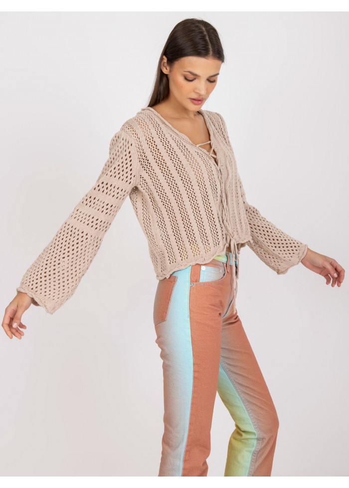 Dámsky sveter, dierkovaný vzor, ozdobná šnúrka vpredu, spôsob prania: pranie v práčke na 30°c, materiál: 60% bavlna, 40% polyester, univerzálna veľkosť, miery modelky: výška: 178 cm, prsia: 82 cm, pás: 61 cm, boky: 88 cm, rozmer produktu meraného na plocho:, šírka pod plecami: 51 cm, dĺžka rukáva: 55 cm, celková dĺžka: 50 cm.