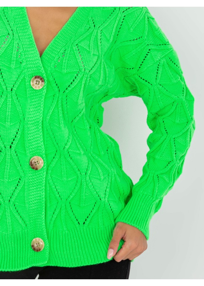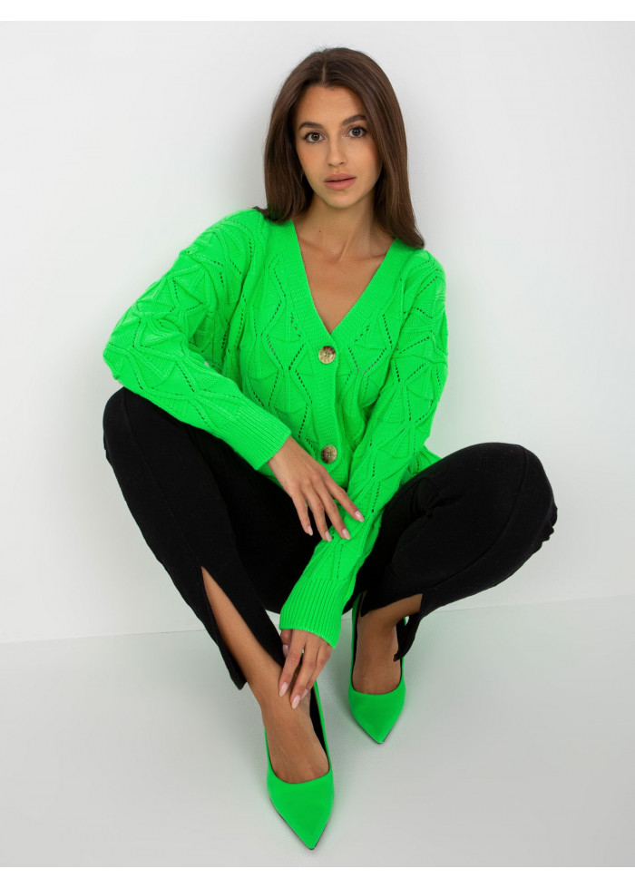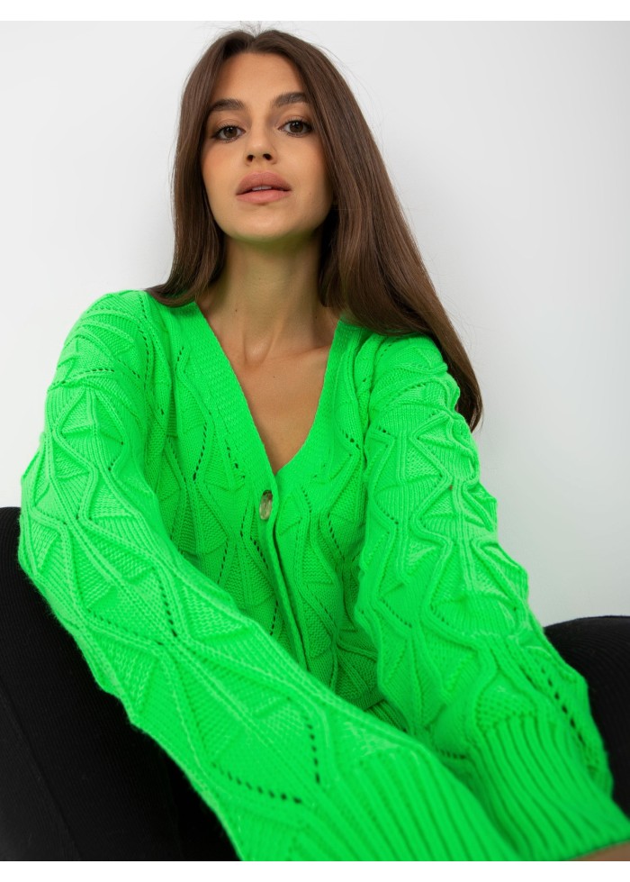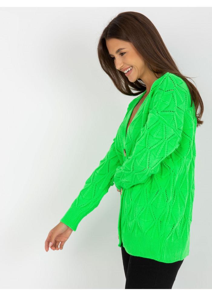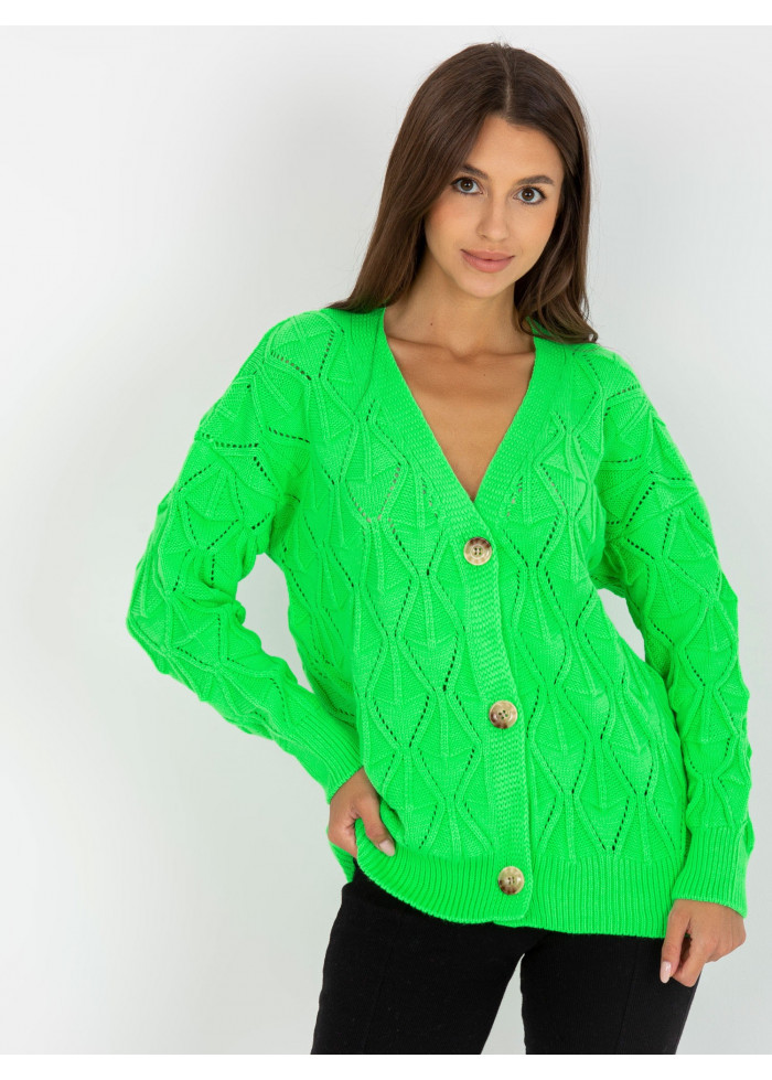 Dámsky pletený sveter, zapínanie na gombíky, univerzálna veľkosť, miery modelky: výška: 172 cm, prsia: 88 cm, pás: 63 cm, boky: 92 cm, rozmer produktu meraného na plocho:, šírka pod plecami: 56 cm, dĺžka rukáva: 55 cm, celková dĺžka: 63 cm.