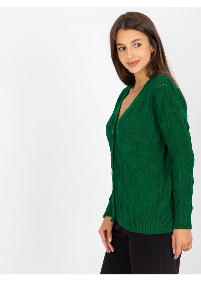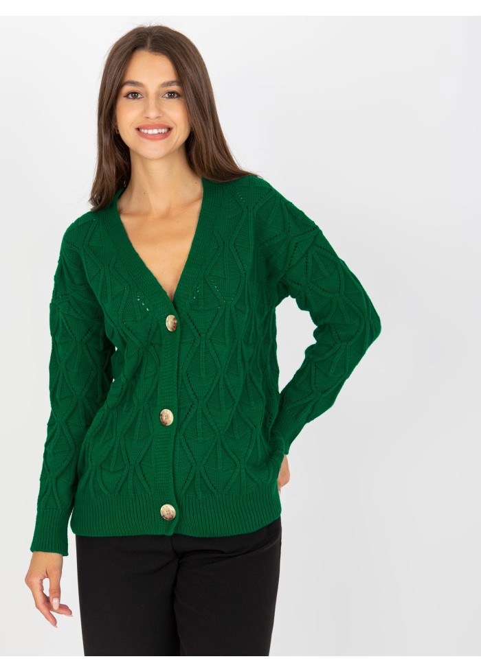 Dámsky pletený sveter, zapínanie na gombíky, univerzálna veľkosť, miery modelky: výška: 172 cm, prsia: 88 cm, pás: 63 cm, boky: 92 cm, rozmer produktu meraného na plocho:, šírka pod plecami: 56 cm, dĺžka rukáva: 55 cm, celková dĺžka: 63 cm.