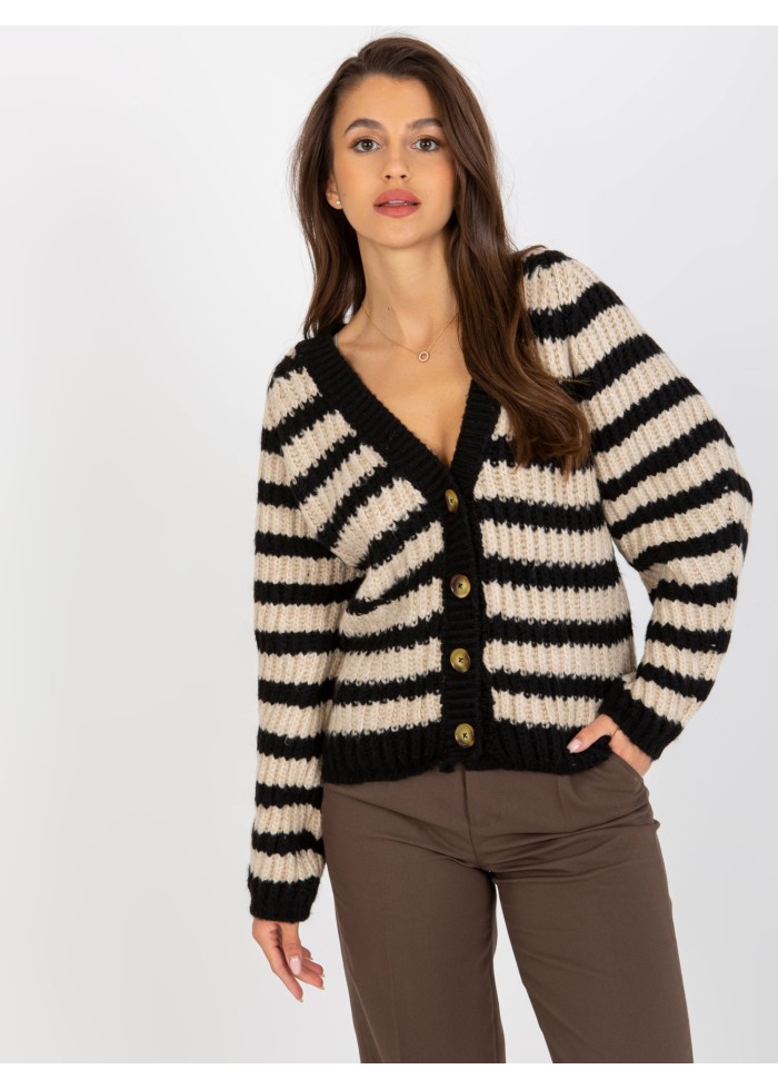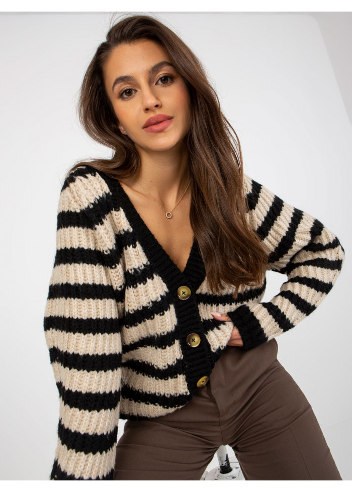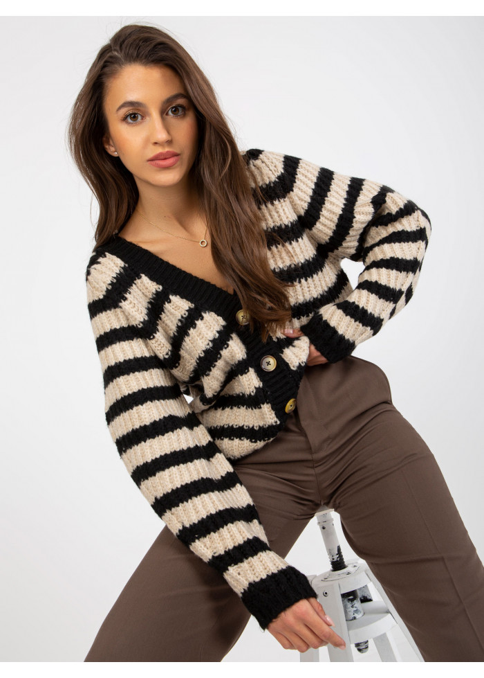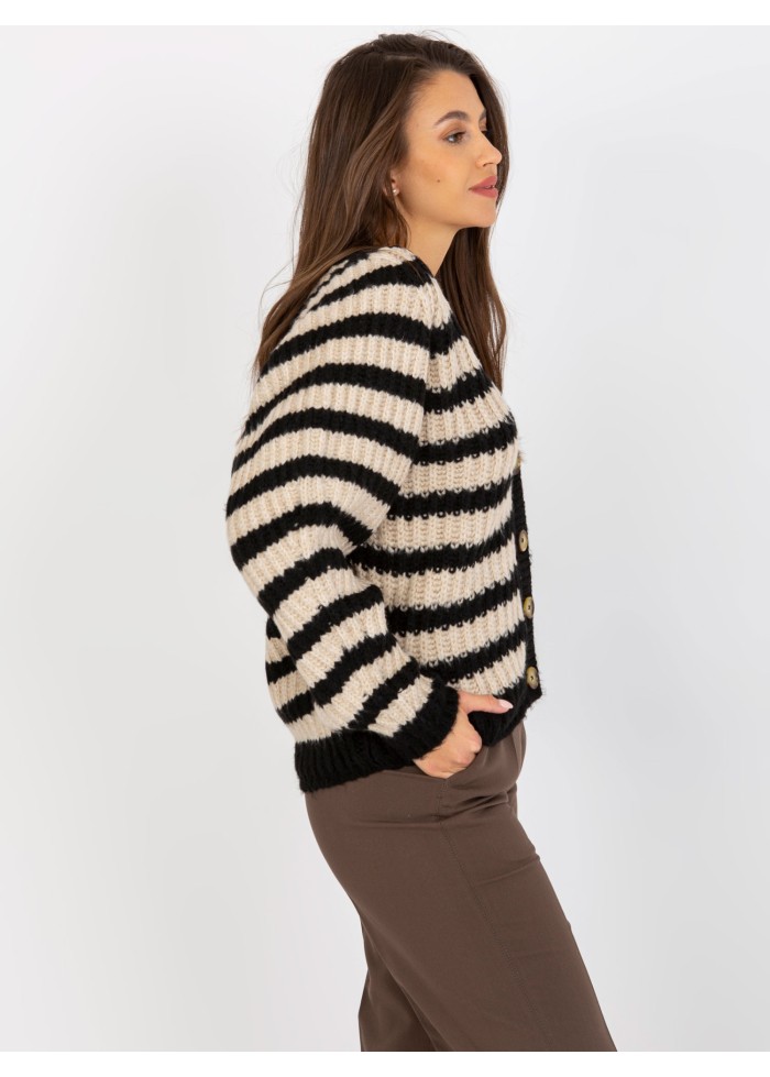 Pruhovaný sveter, zapínanie na gombíky, univerzálna veľkosť, miery modelky: výška: 172 cm, prsia: 88 cm, pás: 63 cm, boky: 92 cm, rozmer produktu meraného na plocho:, šírka pod plecami: 56 cm, dĺžka rukáva: 60 cm, celková dĺžka: 72 cm.