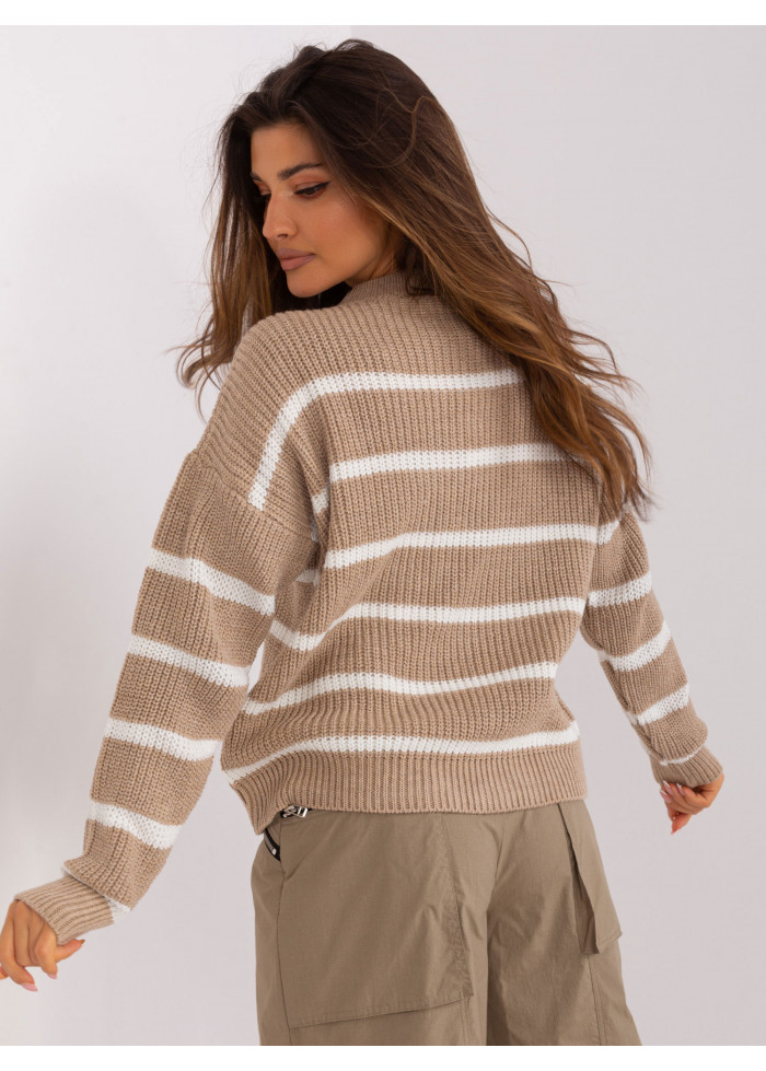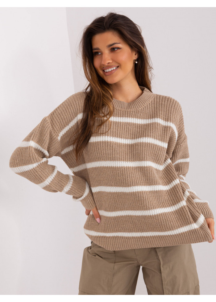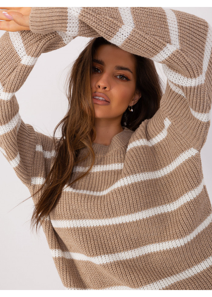 Dámsky pletený sveter, okrúhly výstrih, pruhovaný dizajn, univerzálna veľkosť, miery modelky: výška: 167 cm, prsia: 73 cm, pás: 64 cm, boky: 91 cm, rozmer produktu meraného na plocho:, šírka pod plecami: 65 cm, dĺžka rukáva: 64 cm, celková dĺžka: 59 cm.