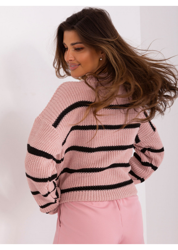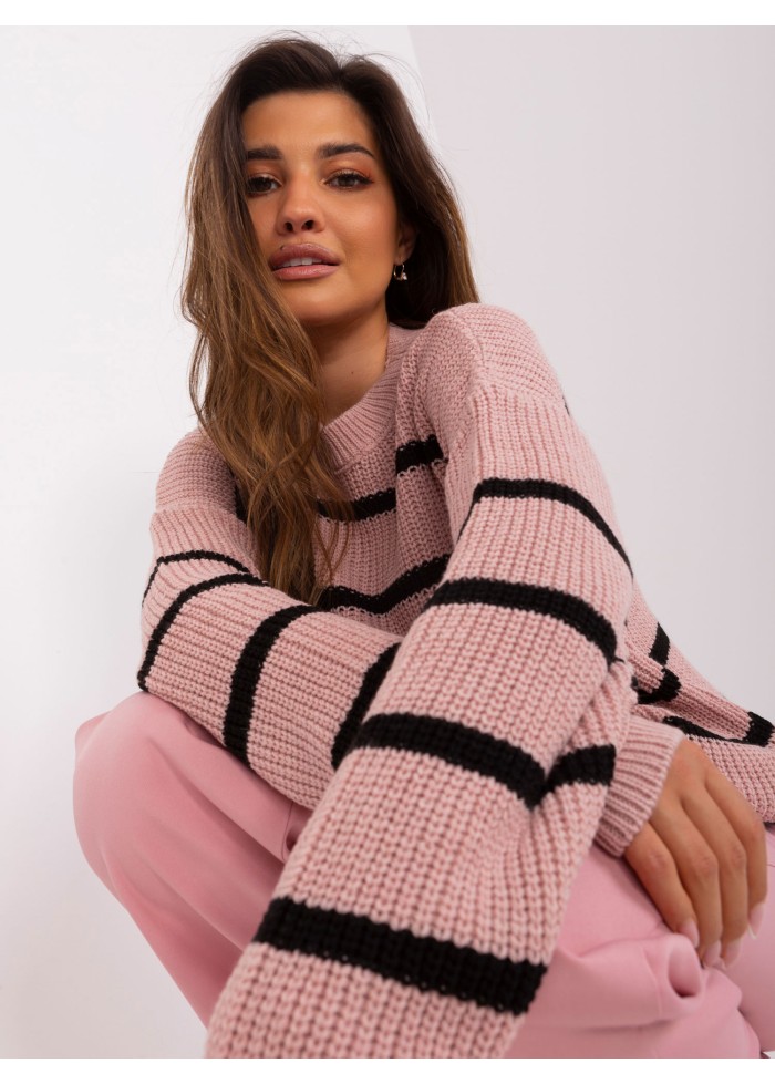 Dámsky pletený sveter, okrúhly výstrih, pruhovaný dizajn, univerzálna veľkosť, miery modelky: výška: 167 cm, prsia: 73 cm, pás: 64 cm, boky: 91 cm, rozmer produktu meraného na plocho:, šírka pod plecami: 65 cm, dĺžka rukáva: 64 cm, celková dĺžka: 59 cm.