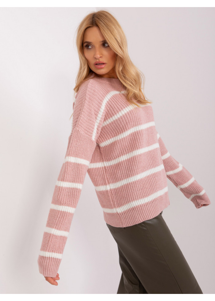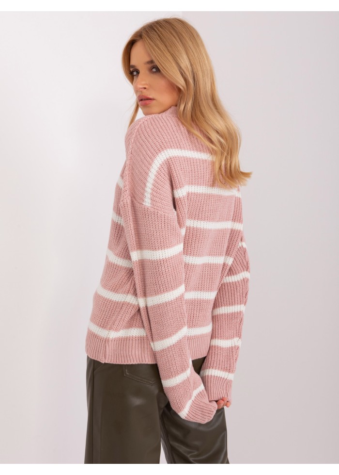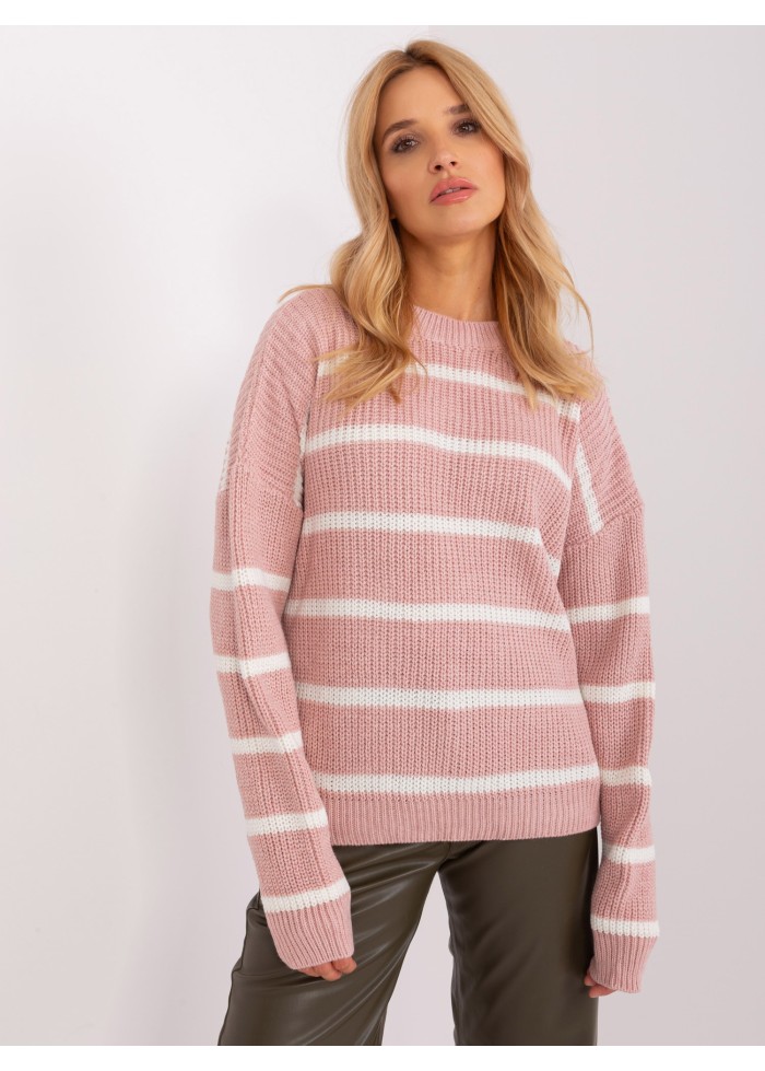 Dámsky pletený sveter, okrúhly výstrih, pruhovaný dizajn, univerzálna veľkosť, miery modelky: výška: 167 cm, prsia: 73 cm, pás: 64 cm, boky: 91 cm, rozmer produktu meraného na plocho:, šírka pod plecami: 65 cm, dĺžka rukáva: 64 cm, celková dĺžka: 59 cm.