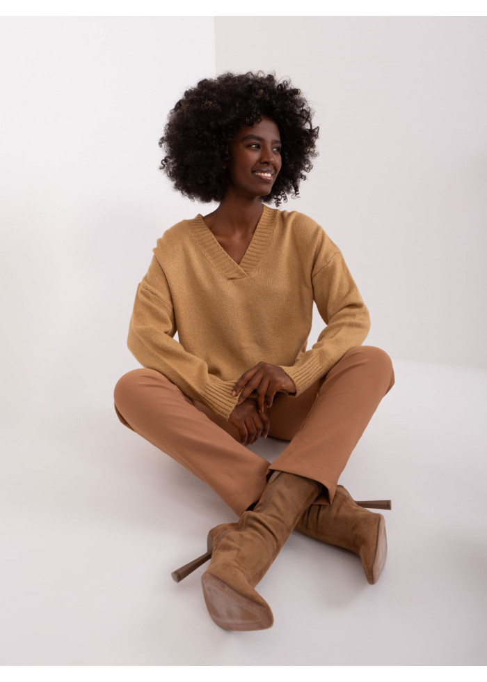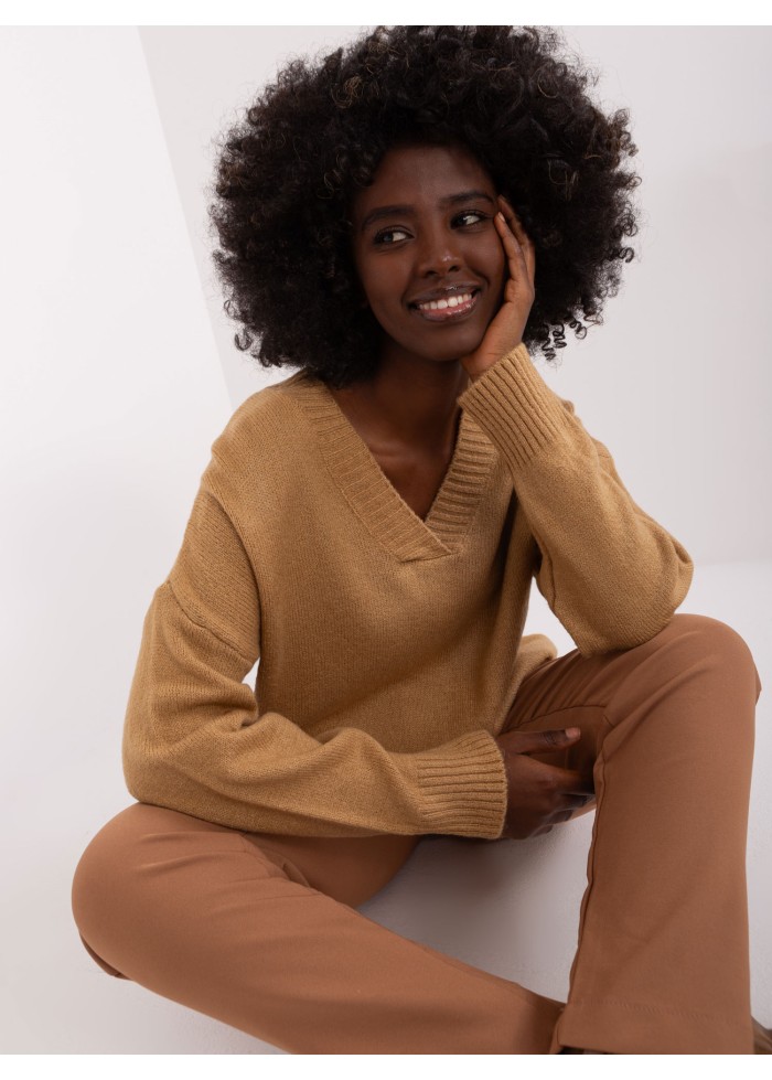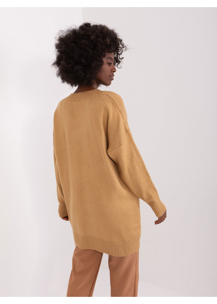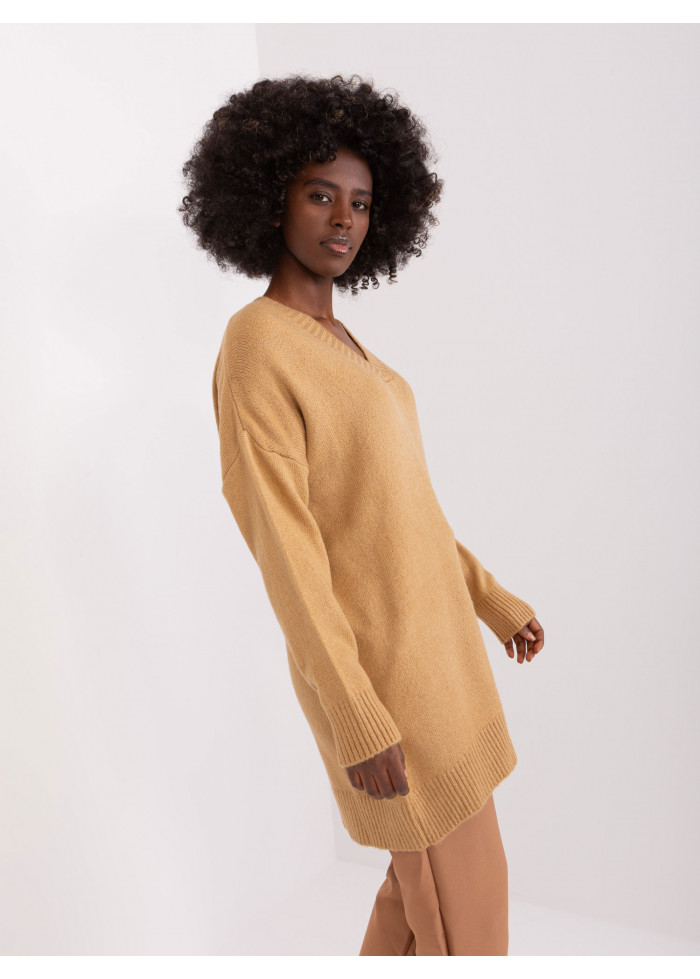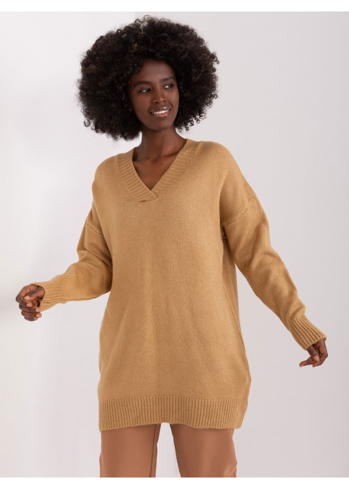 Dámsky sveter, predĺžený pulóver, jemný úplet, výstrih do v, lémy na koncoch rukávov v spodnej časti a pri krku, univerzálna veľkosť, miery modelky: výška: 168 cm, prsia: 82 cm, pás: 62 cm, boky: 93 cm, rozmer produktu meraného na plocho:, šírka pod plecami: 59 cm, dĺžka rukáva: 60 cm, celková dĺžka: 72 cm.