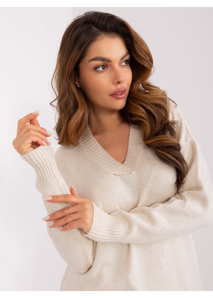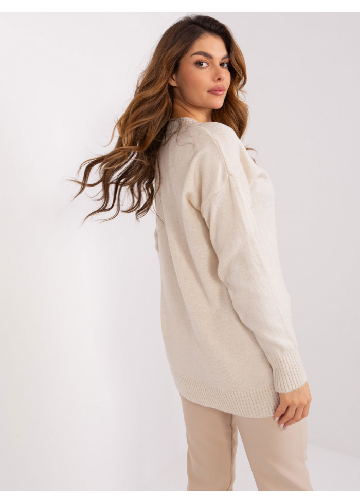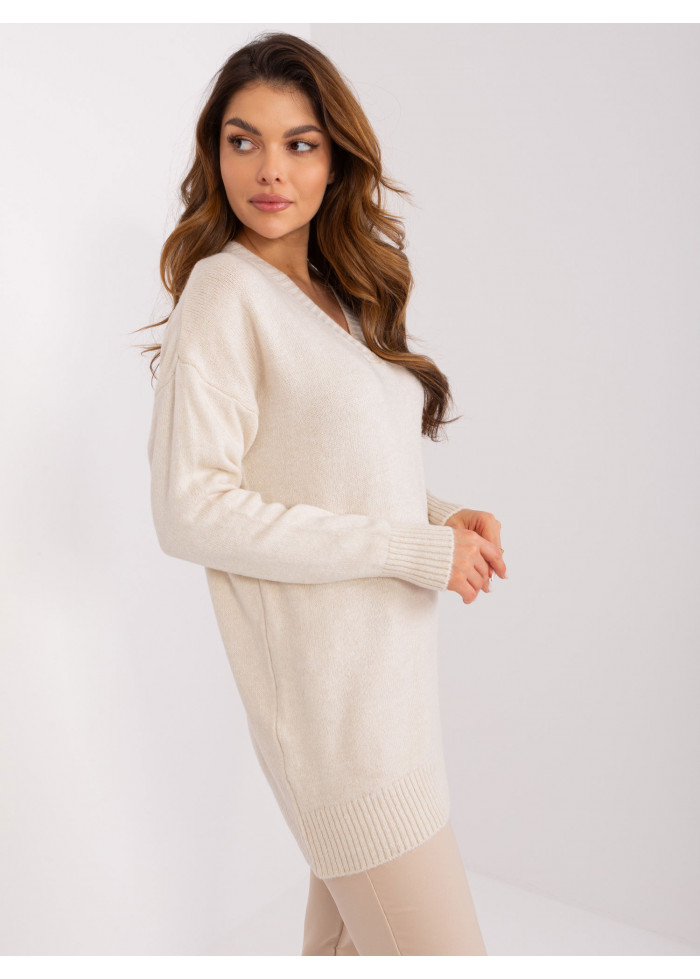 Dámsky sveter, predĺžený pulóver, výstrih do v, lémy na koncoch rukávov v spodnej časti a pri krku, jemný úplet, univerzálna veľkosť, miery modelky: výška: 173 cm, prsia: 85 cm, pás: 62 cm, boky: 95 cm, rozmer produktu meraného na plocho:, šírka pod plecami: 59 cm, dĺžka rukáva: 60 cm, celková dĺžka: 72 cm.