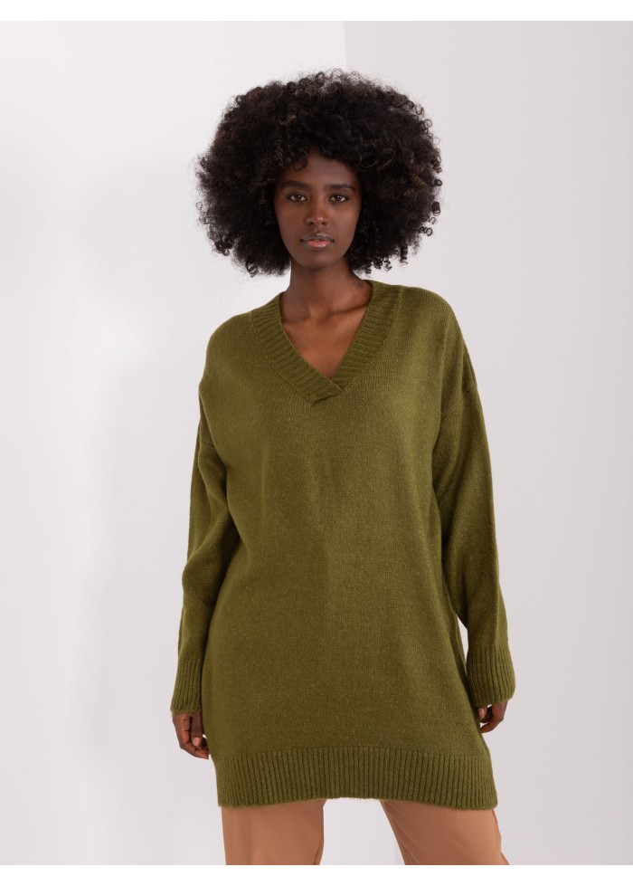 Dámsky sveter, predĺžený pulóver, výstrih do v, lémy na koncoch rukávov v spodnej časti a pri krku, jemný úplet, univerzálna veľkosť, miery modelky: výška: 173 cm, prsia: 85 cm, pás: 62 cm, boky: 95 cm, rozmer produktu meraného na plocho:, šírka pod plecami: 59 cm, dĺžka rukáva: 60 cm, celková dĺžka: 72 cm.