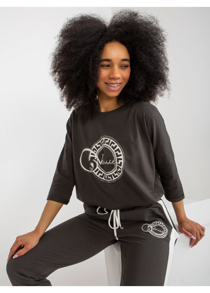 Dámska tepláková súprava, dámske tričko s potlačou, okrúhly výstrih, 3/4 rukávy, šnúrka na stiahnutie v spodnej časti, dlhé nohavice na gumu v páse, lémy na spodku nohavíc, 2 vrecká, ozdobné lampasy, ozdobná potlač, modelka má na sebe veľkosť s/m, miery modelky: 173 cm, prsia: 90 cm, pás: 64 cm, boky: 93 cm, rozmer produktu meraného na plocho, vo veľkosti s/m:, šírka pod plecami: 62 cm, dĺžka rukáva: 41 cm, celková dĺžka: 58 cm, šírka nohavíc v páse: 34 cm, výška sedu: 33 cm, dĺžka nohavíc: 100 cm.