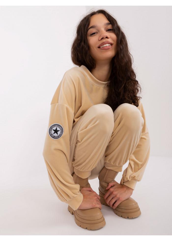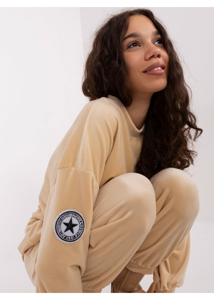 Velúrová tepláková súprava, mikina, okrúhly výstrih, lémy na koncoch rukávov a v spodnej časti, ozdobná nášivka, dlhé nohavice na gumu v páse, ozdobná šnúrka v páse, 2 vrecká, lémy na spodku nohavíc, univerzálna veľkosť, miery modelky: výška: 178 cm, prsia: 80 cm, pás: 58 cm, boky: 88 cm, rozmer produktu meraného na plocho:, šírka pod plecami: 56 cm, dĺžka rukáva: 56 cm, celková dĺžka: 58 cm, šírka nohavíc v páse: 38 cm, dĺžka nohavíc: 96 cm.