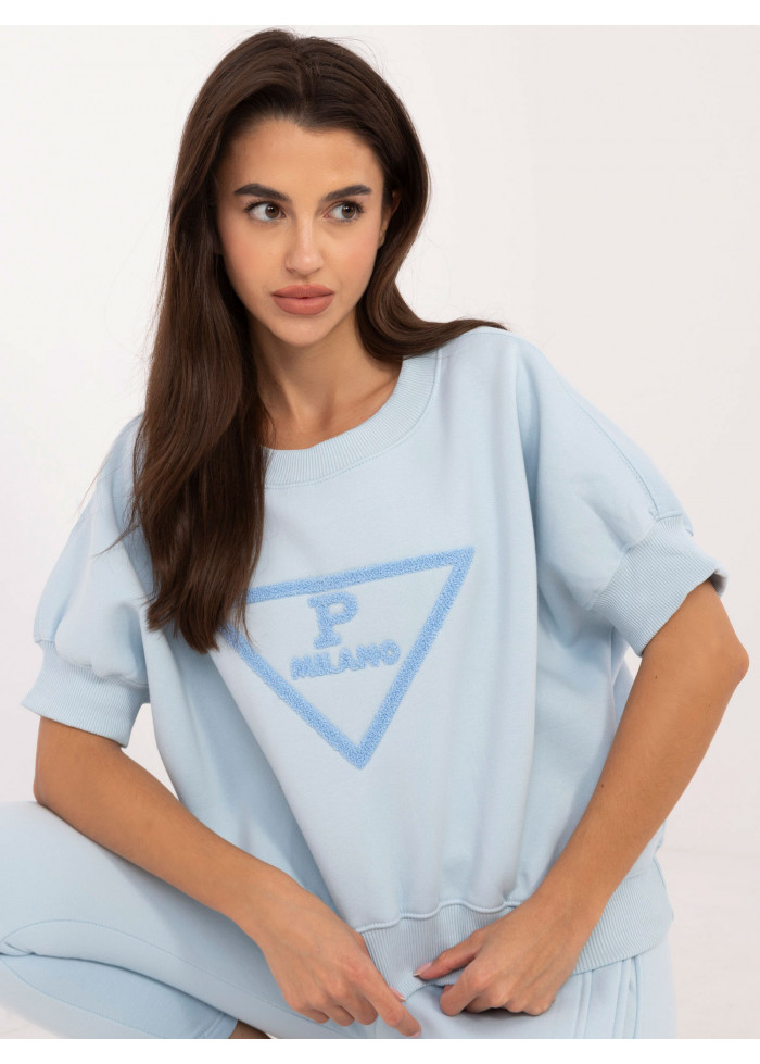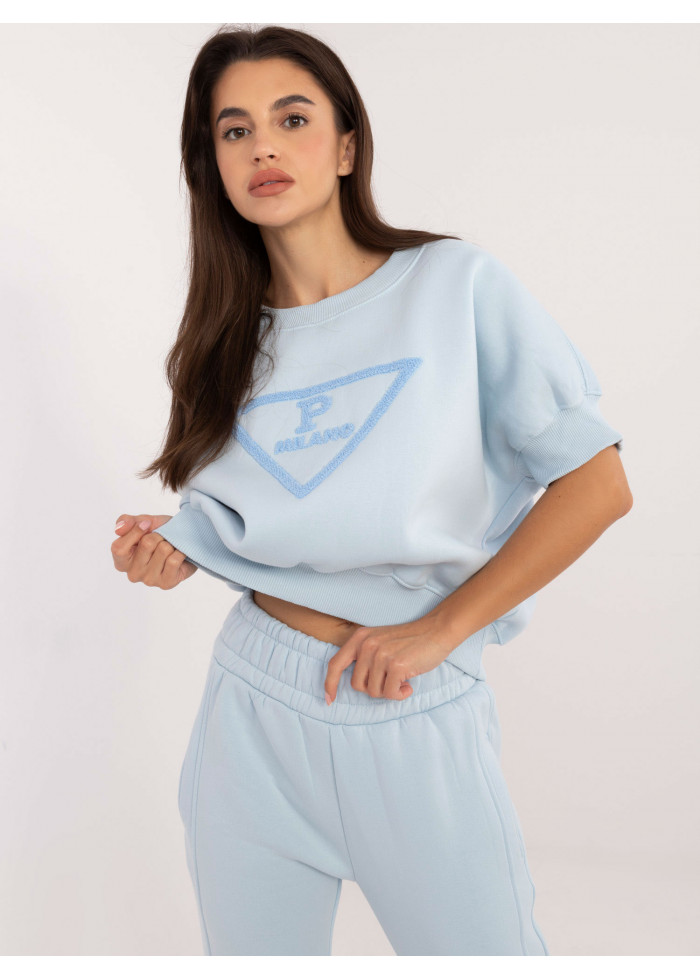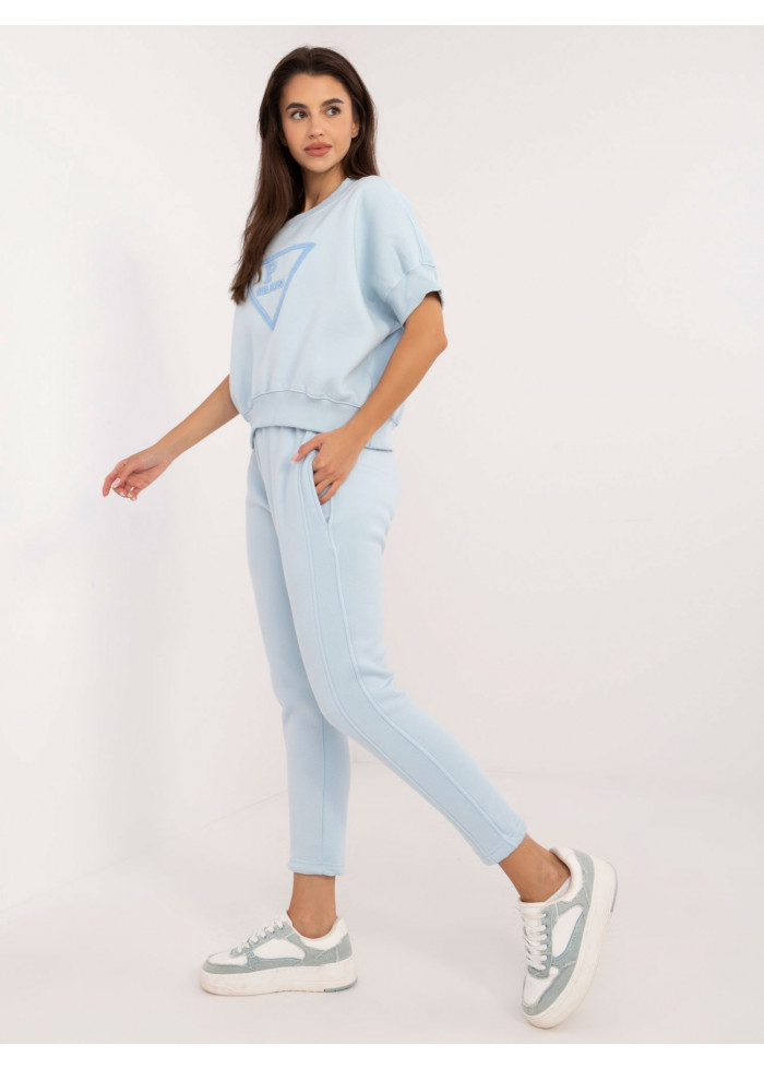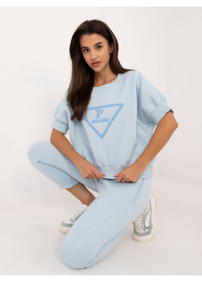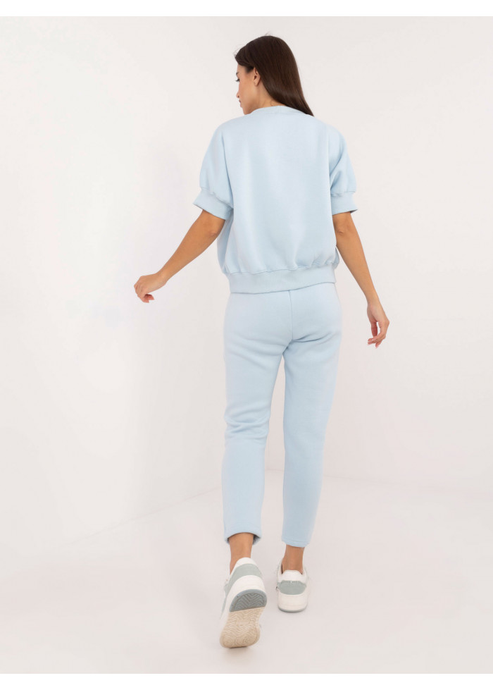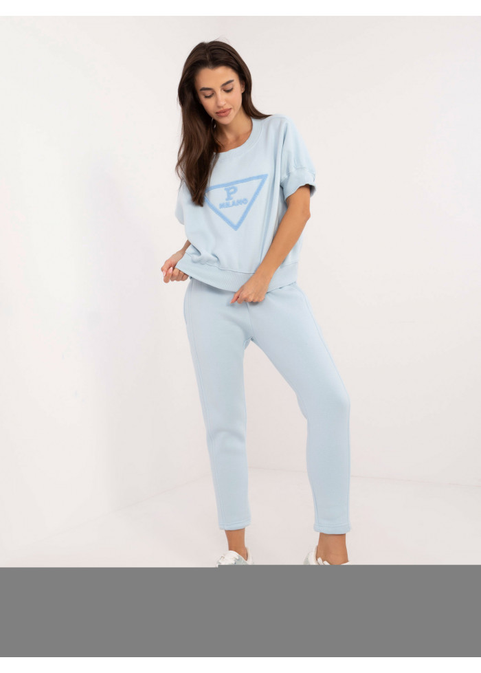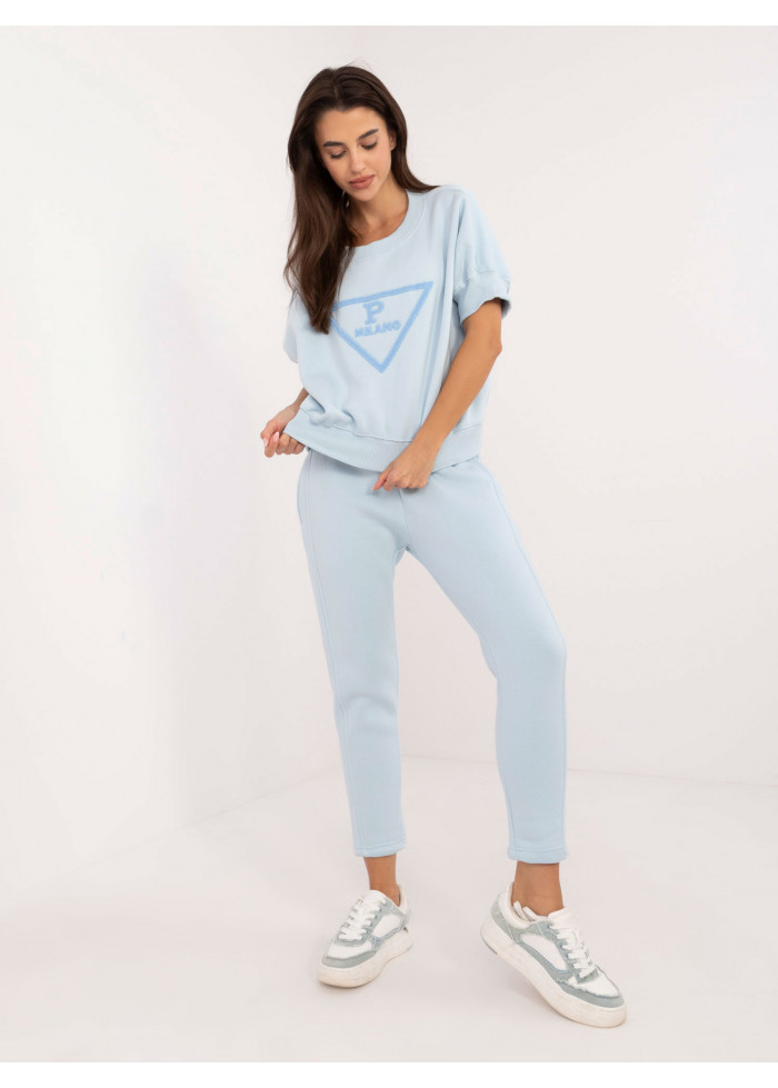 Voľnočasová tepláková súprava, mikina s krátkym rukávom, klasický rukáv ukončený lémom, ozdobná aplikácia na tričku, dámske tepláky s vyšším pásom, elastická guma v páse, dve vrecká, modelka má na sebe univerzálnu veľkosť, miery modelky: výška: 172 cm, prsia: 88 cm, pás: 63 cm, boky: 92 cm, rozmer produktu meraného na plocho:, šírka mikiny pod pazuchou - 72 cm, dĺžka mikiny - 56 cm, šírka nohavíc v páse - 38 cm, výška v páse - 34 cm, dĺžka nohavíc - 97 cm.