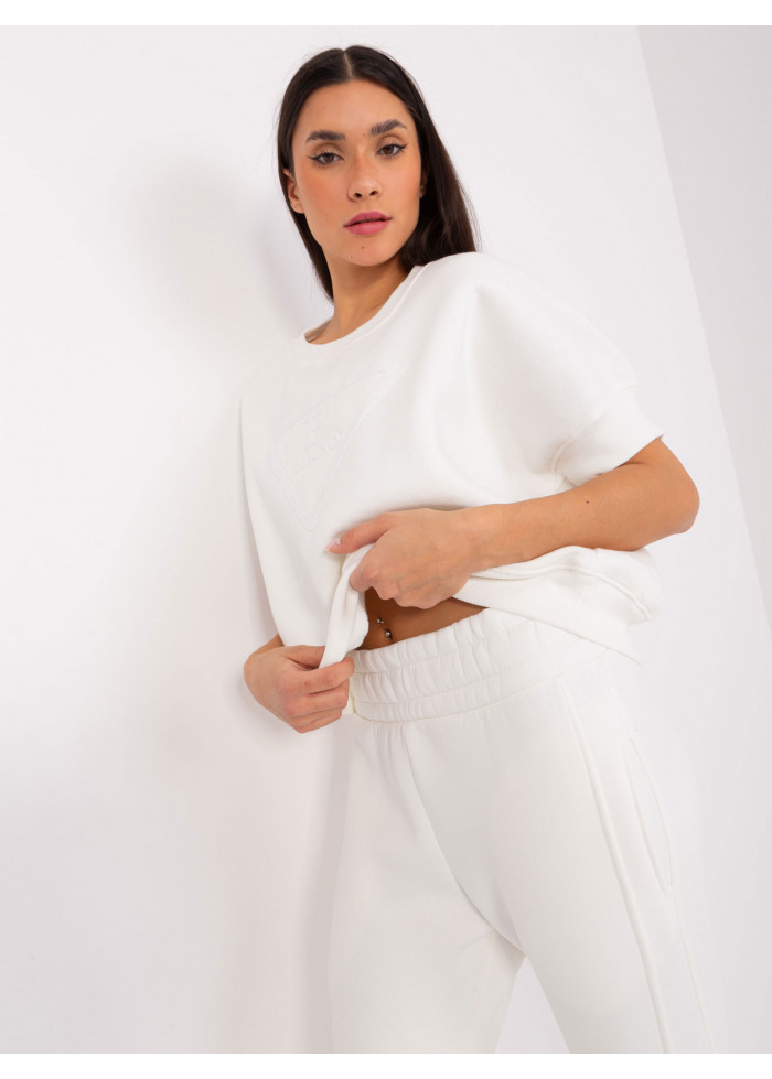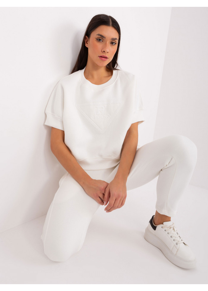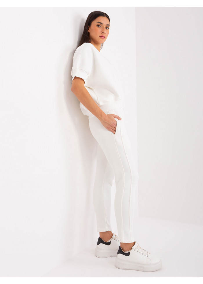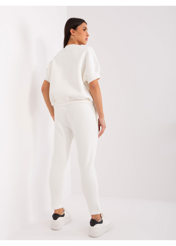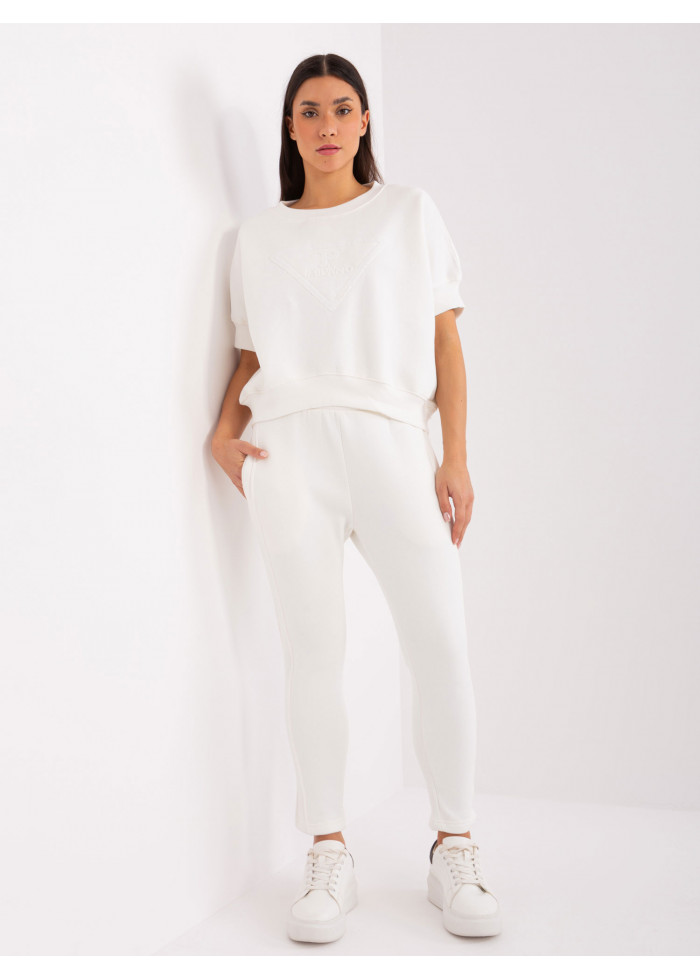 Teplákový komplet, dámske tričko s krátkym rukávom, okrúhly výstrih, ozdobná nášivka, kontrastné lemy na rukávoch a v spodnej časti, dlhé nohavice na gumu v páse, 2 vrecká, ozdobné prešívanie, univerzálna veľkosť, miery modelky: výška: 172 cm, prsia: 83 cm, pás: 63 cm, boky: 91 cm, rozmer produktu meraného na plocho:, šírka pod plecami: 72 cm, celková dĺžka: 56 cm, šírka nohavíc v páse: 38 cm, výška sedu: 34 cm, dĺžka nohavíc: 97 cm.