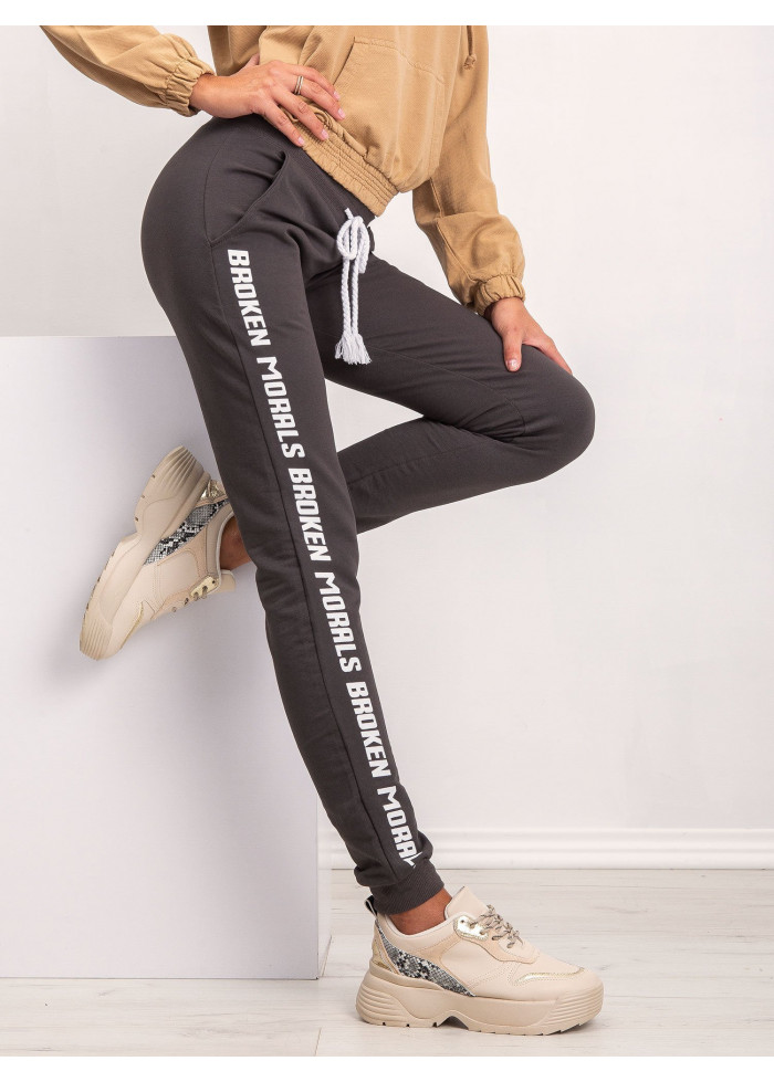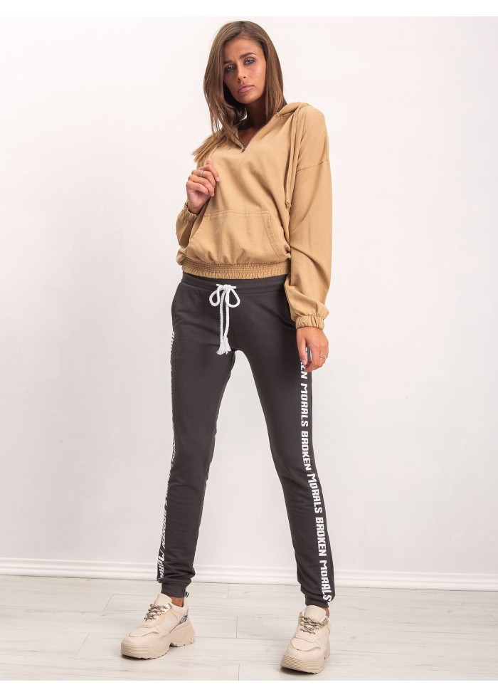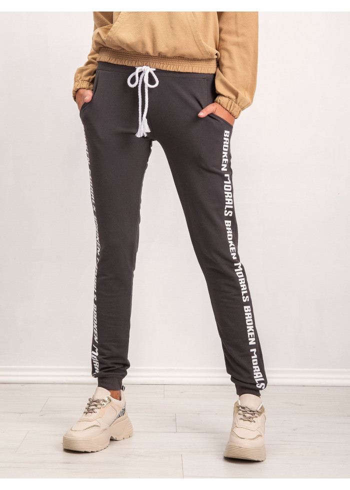 Dámske bavlnené tepláky, úzky strih, široká guma v páse, sťahovacia šnúrka v páse, lémy na spodku nohavíc, 2 bočné vrecká, potlač po dĺžke nohavíc, materiál: 90% bavlna, 10% elastan, spôsob prania: pranie v práčke na 30°c, modelka má na sebe veľkosť s. rozmery modelky: výška 176 cm, prsia 85 cm, pás 64 cm, boky 92 cm..