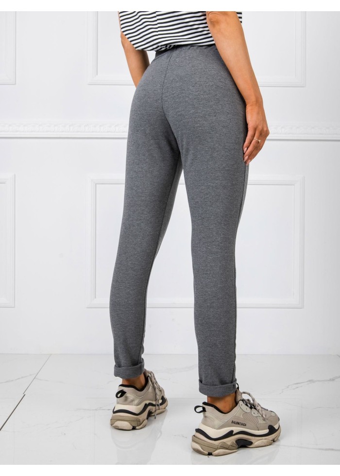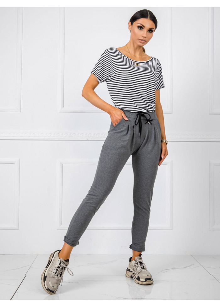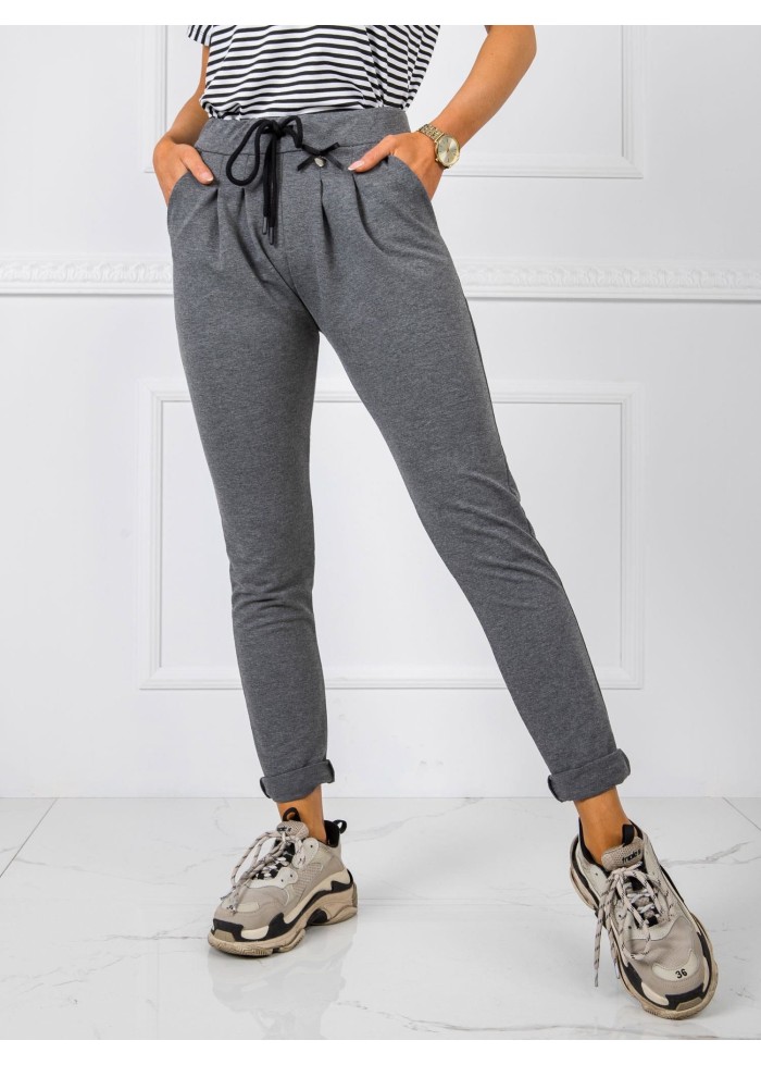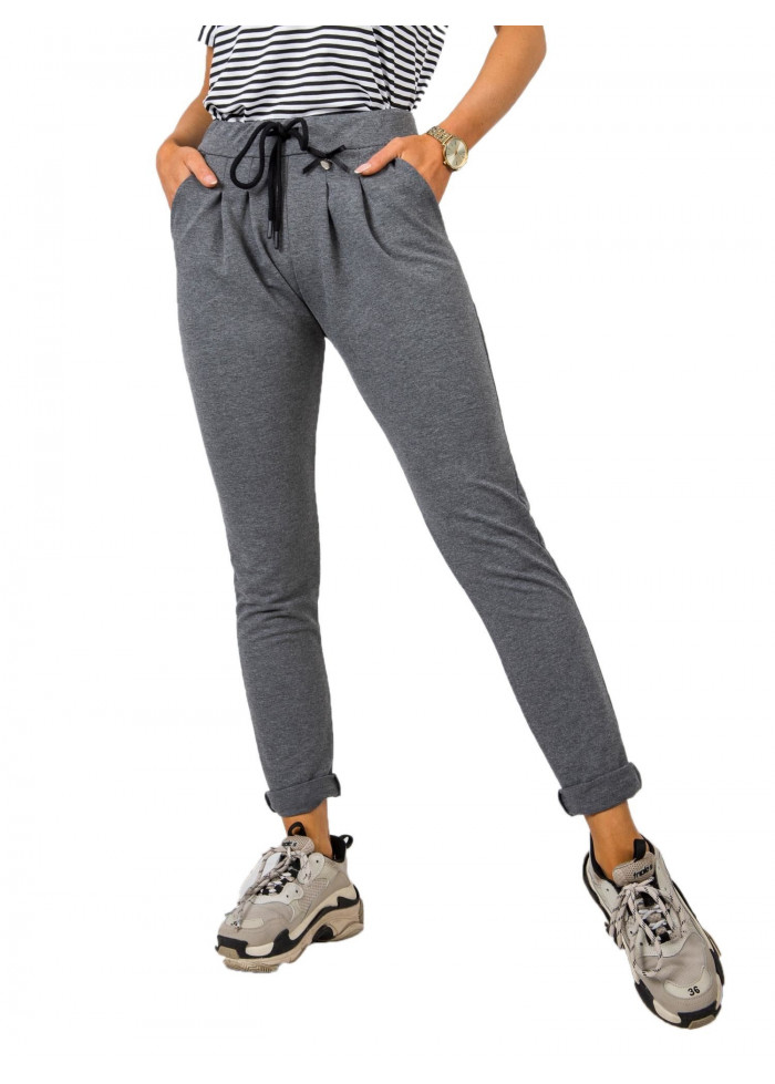 Dámske tepláky, sťahujúca guma v páse s ozdobnou šnúrkou, 2 vrecká, ozdobné riasenie, spôsob prania: pranie v práčke na 30°c, materiál: 90% bavlna, 10% elastan, modelka má na sebe veľkosť s. rozmery modelky: výška 168 cm, prsia 89 cm, pás 60 cm, boky 91 cm..