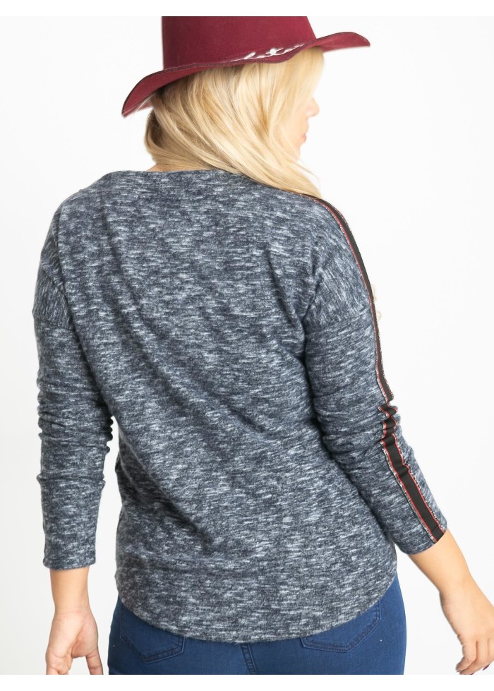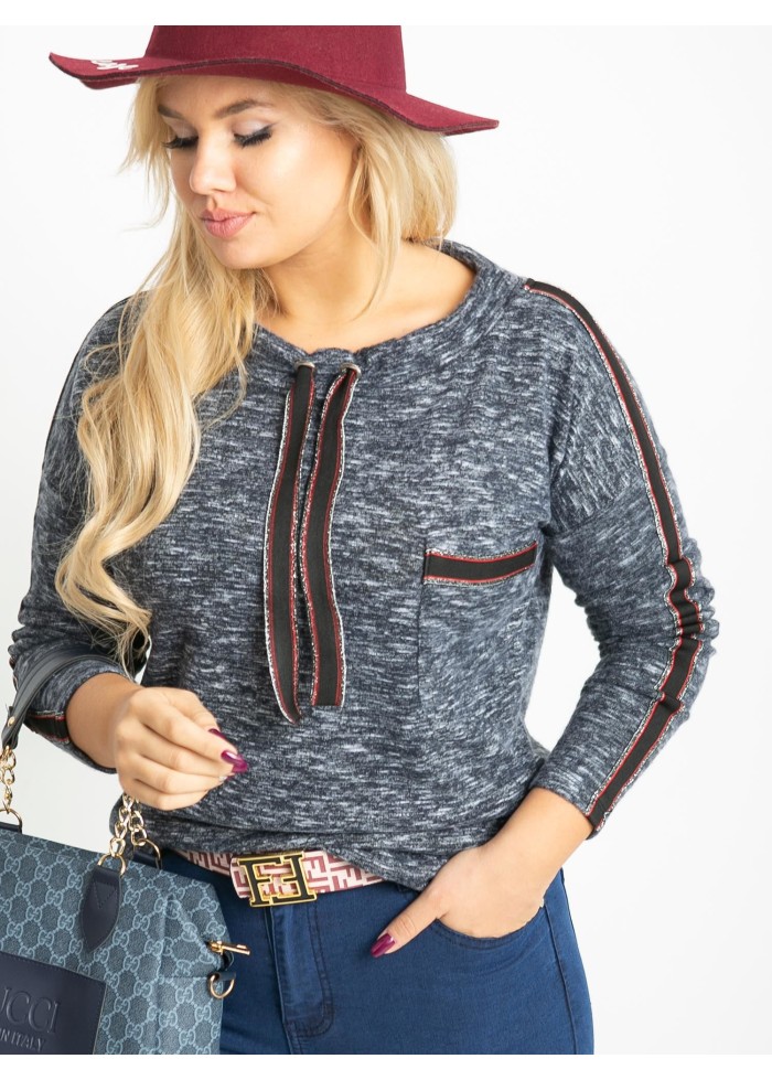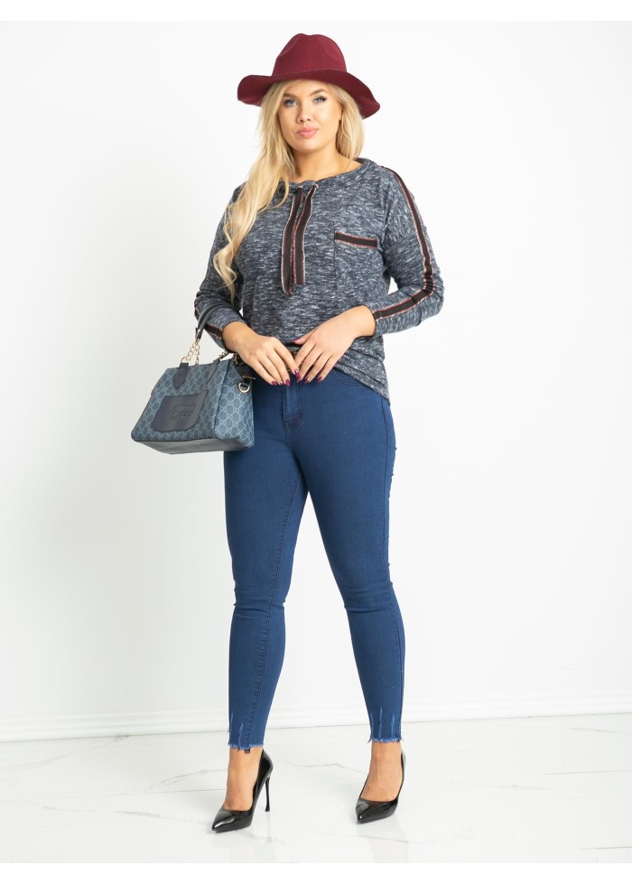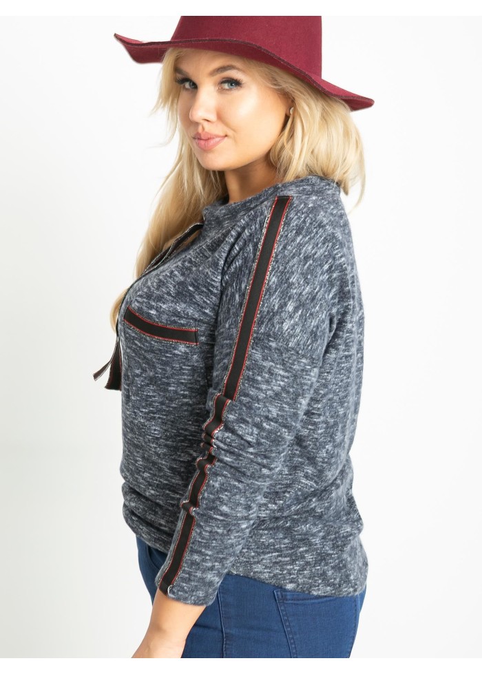Dámske tričko s dlhým rukávom, mäkký a príjemný melírovaný materiál, ozdobné aplikácie, ozdobné šnúrky na golieri, plus size strih, spôsob prania: pranie v práčke na 30°c, materiál: 90% bavlna, 10% elastan, univerzálna veľkosť, miery modelky: výška: 172 cm, prsia: 105 cm, pás: 76 cm, boky: 105 cm, sedí na veľkosť xl a 2xl.