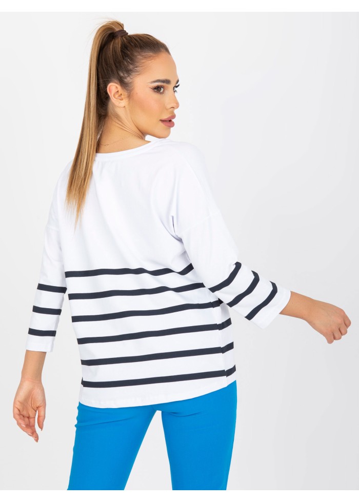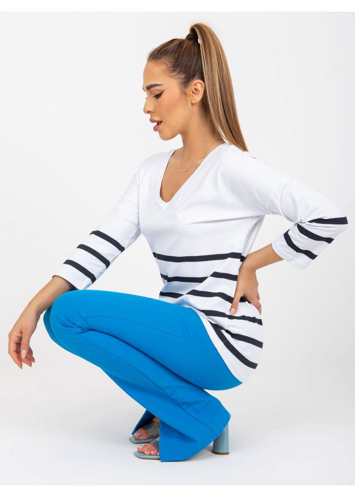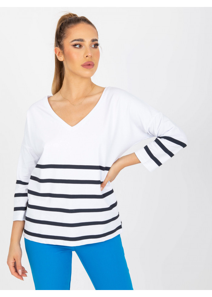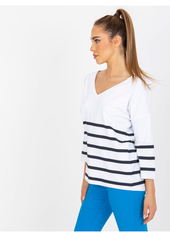 Bavlnené dámske tričko, voľnejší strih, výstrih do v, pruhovaný dizajn, dlhý rukáv, spôsob prania: pranie v práčke na 30°c, materiál: 90% bavlna, 10% elastan, modelka má na sebe veľkosť s/m, miery modelky: výška: 167 cm, prsia: 82 cm, pás: 59 cm, boky: 83 cm, rozmer produktu meraného na plocho, vo veľkosti s/m:, šírka pod plecami: 57 cm, dĺžka rukáva: 42 cm, celková dĺžka: 64 cm.