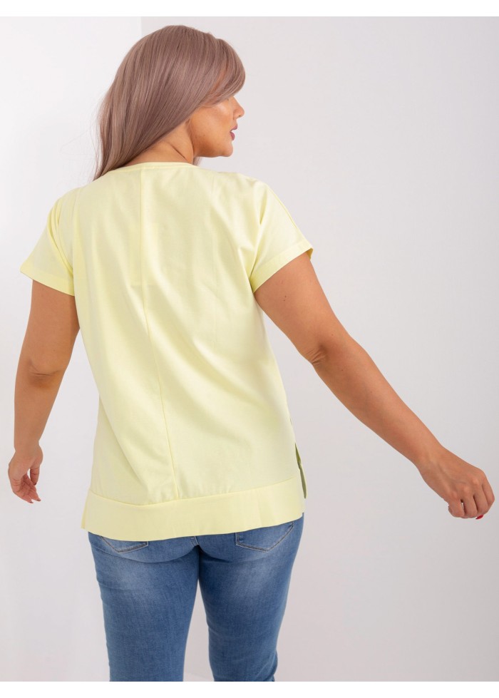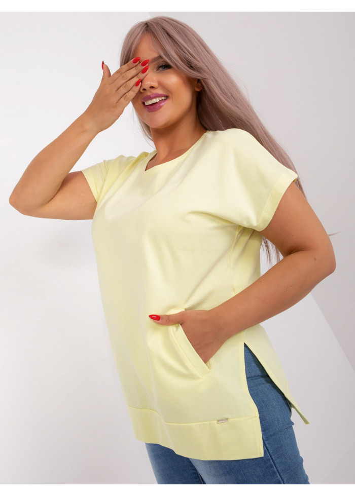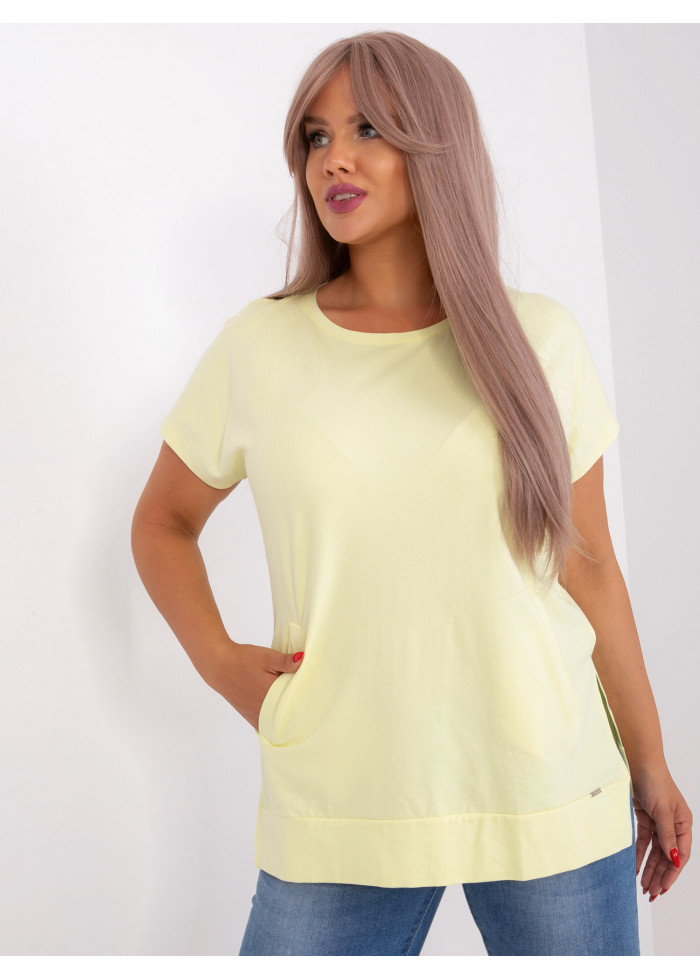 Bavlnené dámske tričko, okrúhly výstrih, krátky rukáv, lém v spodnej časti, rozparky po bokoch, klokanie vrecko, univerzálna veľkosť, miery modelky: výška 172 cm, prsia 103 cm, pás 73 cm, boky 103 cm., rozmer produktu meraného na plocho:, šírka pod plecami: 56 cm, celková dĺžka: 67 cm.