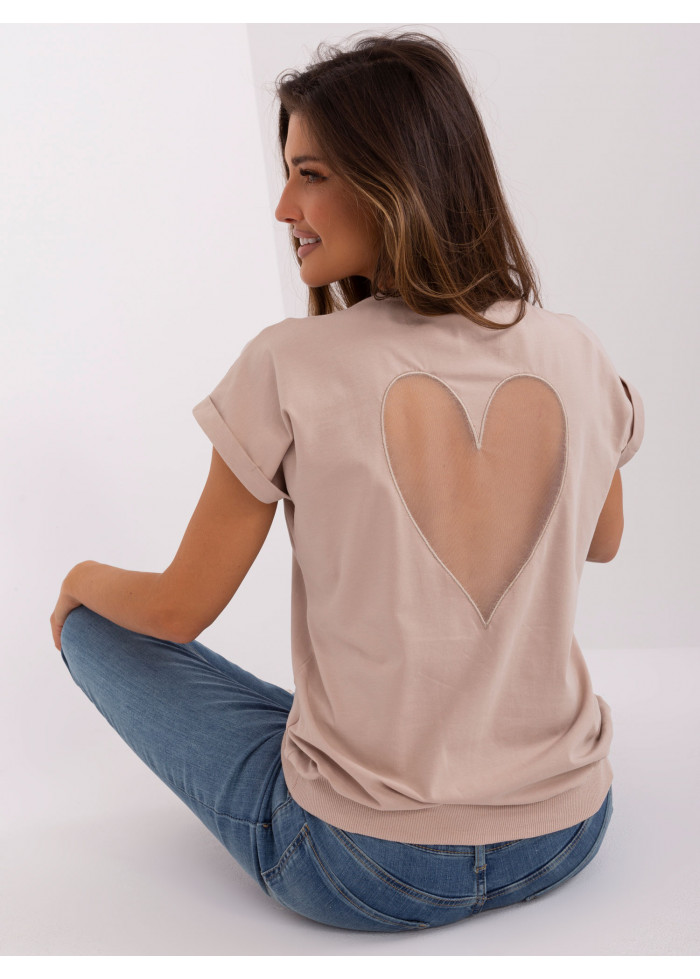Dámske tričko, okrúhly výstrih, krátky rukáv, ozdobný lém na rukávoch, lém na spodnej časti, priehľadná aplikácia na chrbte, univerzálna veľkosť, miery modelky: výška 176 cm, prsia 85 cm, pás: 64 cm, boky: 92 cm, rozmer produktu meraného na plocho:, šírka pod plecami: 48 cm, celková dĺžka: 61 cm.
