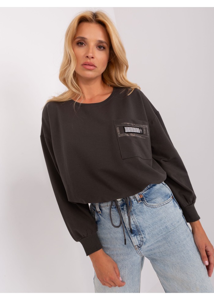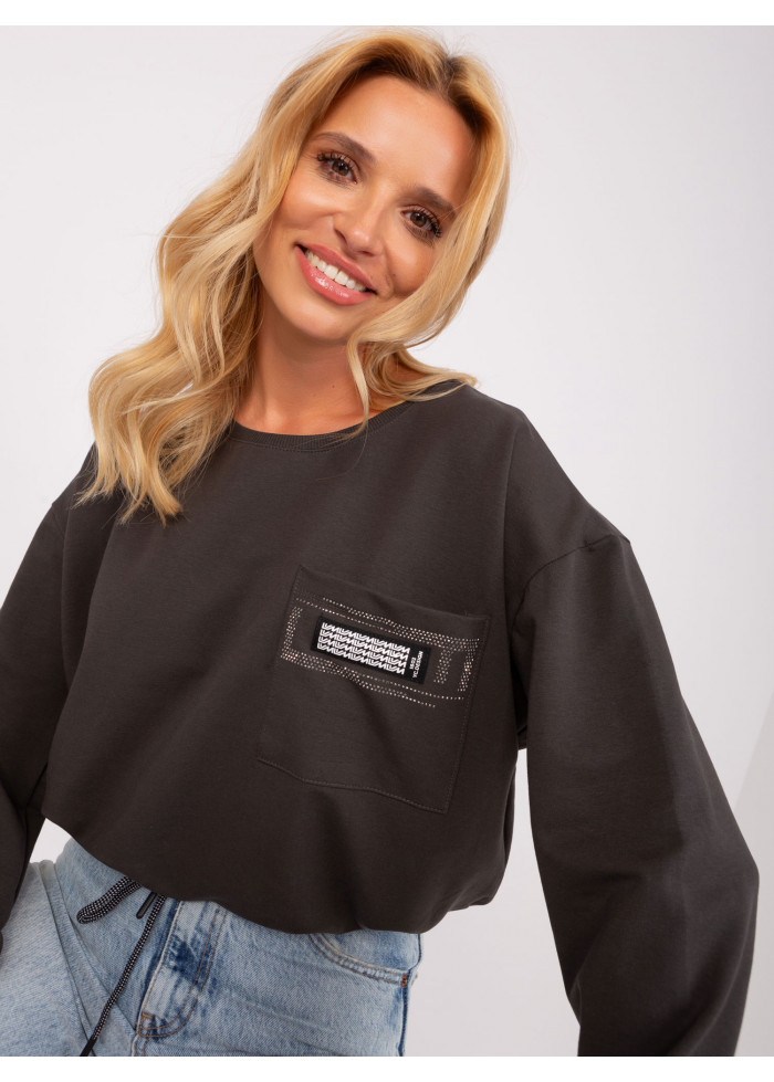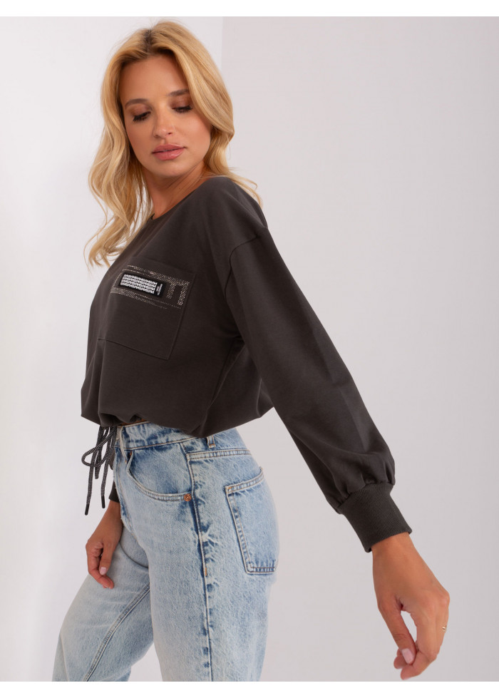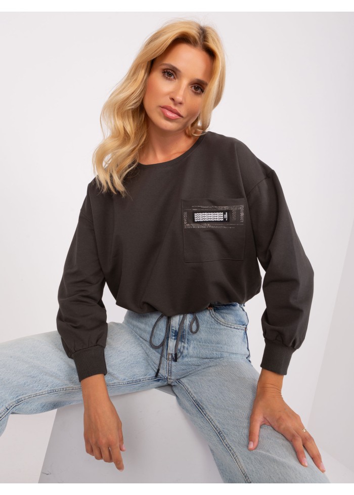 Bavlnené dámske tričko, okrúhly výstrih, šnúrka v spodnej časti, lémy na konci rukávov, ozdobná aplikácia, 1 náprsné vrecko, univerzálna veľkosť, šírka pod plecami: 55 cm, dĺžka rukáva: 45 cm, celková dĺžka: 51 cm.