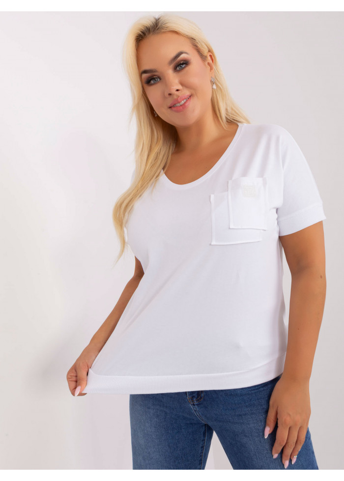 Bavlnené dámske tričko, krátky rukáv s ozdobným lémom, výstrih do v, lém na spodnej časti, náprsné vrecko, univerzálna veľkosť, miery modelky: výška 172 cm, prsia 103 cm, pás 73 cm, boky 103 cm., rozmer produktu:, šírka pod plecami: 60 cm, celková dĺžka: 65 cm.
