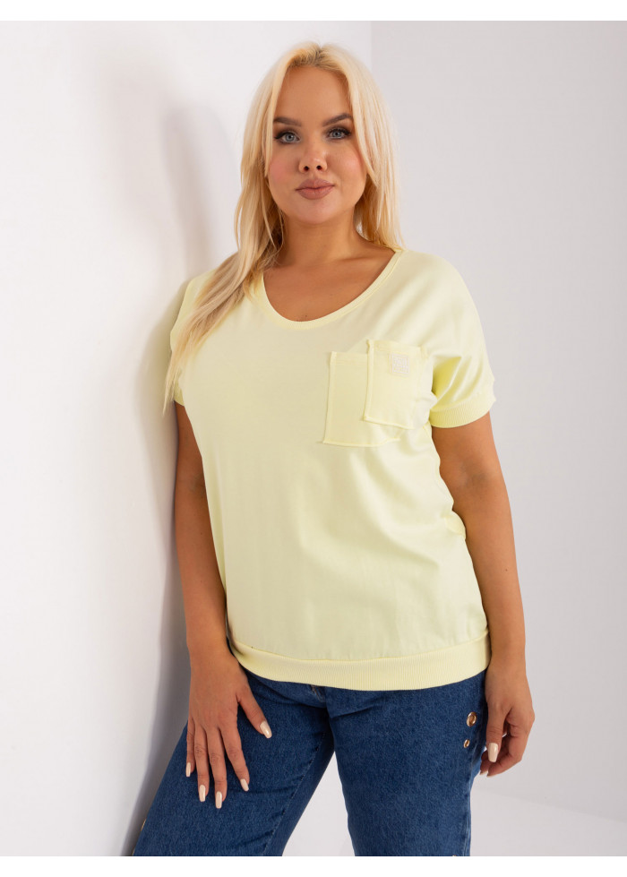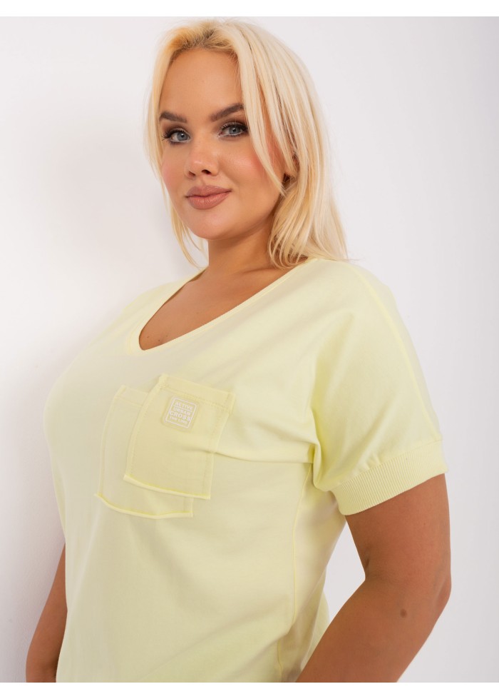 Bavlnené dámske tričko, krátky rukáv s ozdobným lémom, výstrih do v, lém na spodnej časti, náprsné vrecko, univerzálna veľkosť, miery modelky: výška 172 cm, prsia 103 cm, pás 73 cm, boky 103 cm., rozmer produktu:, šírka pod plecami: 60 cm, celková dĺžka: 65 cm.