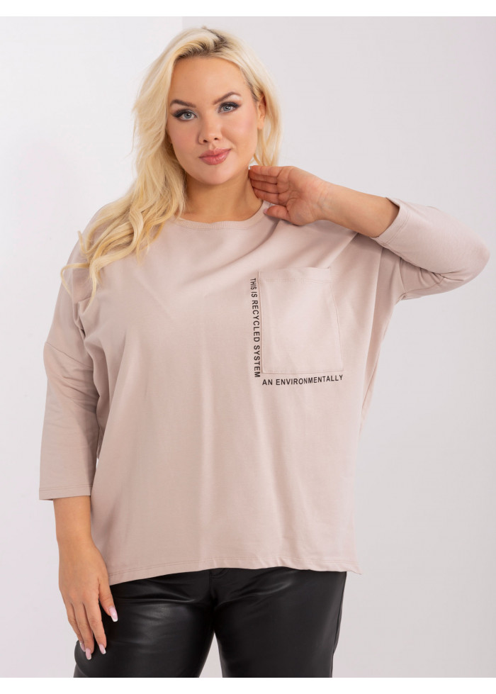 Dámske tričko s 3/4 rukávom, okrúhly výstrih, 1 náprsné vrecko, ozdobné nápisy, asymetrický strih, univerzálna veľkosť, miery modelky: výška 172 cm, prsia 103 cm, pás 73 cm, boky 103 cm., rozmer produktu meraného na plocho:, šírka pod plecami: 73 cm, dĺžka rukáva: 45 cm, celková dĺžka: vpredu: 64 cm, vzadu: 79 cm.