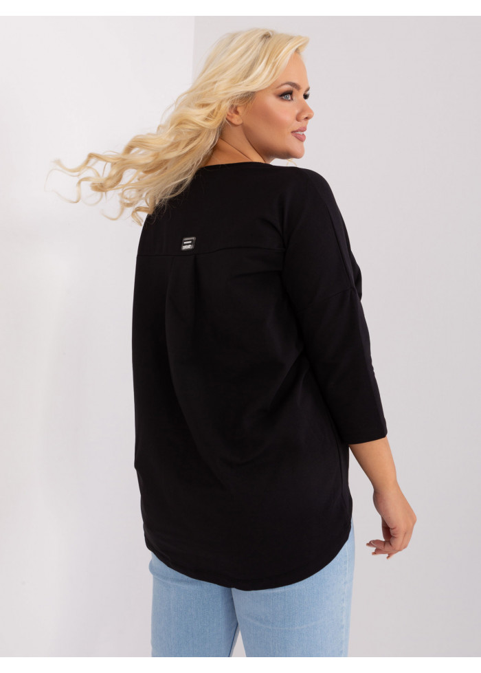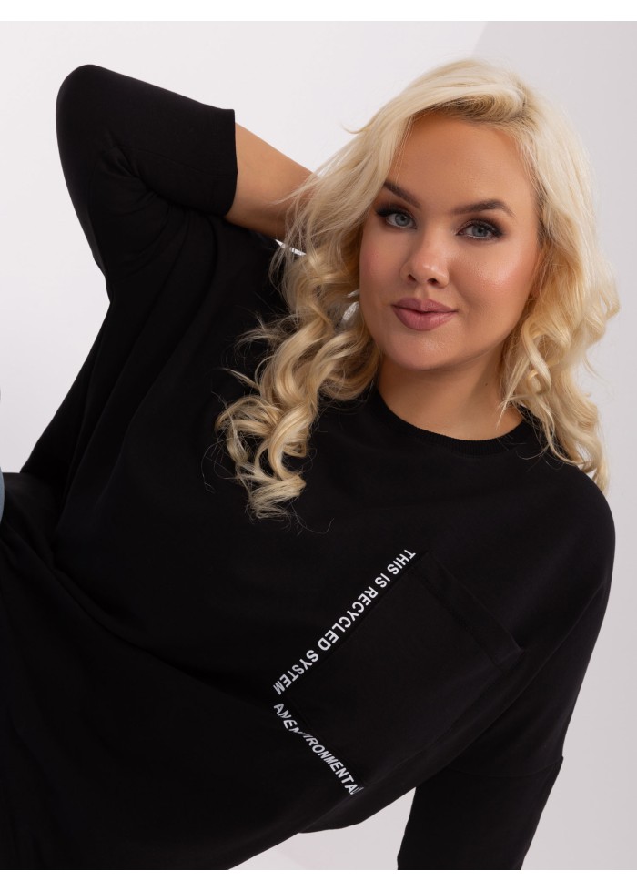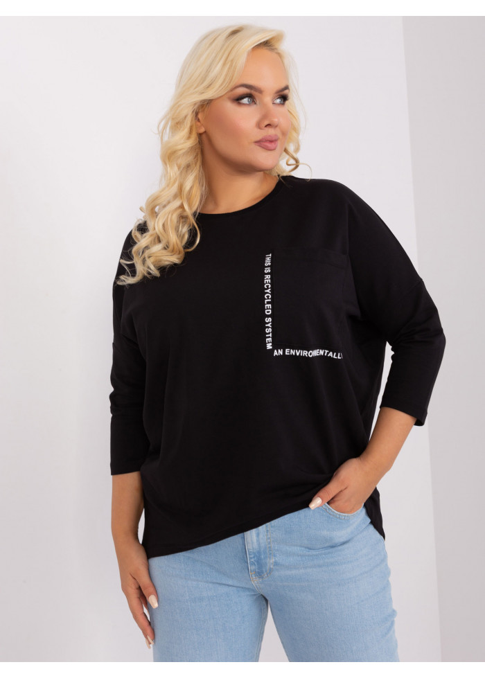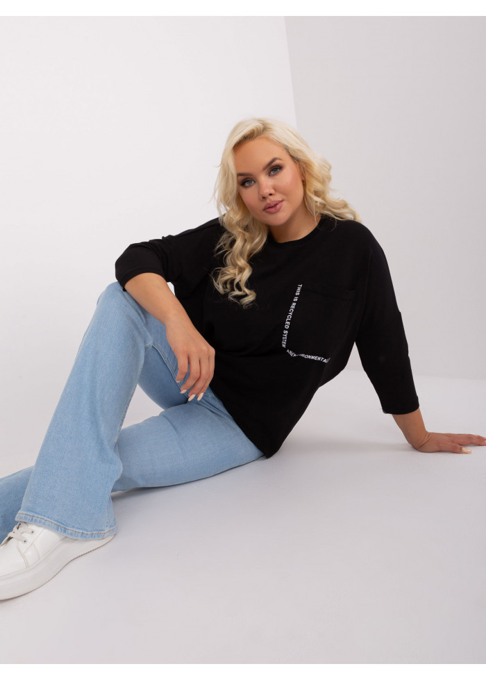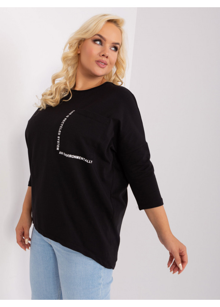 Dámske tričko s 3/4 rukávom, okrúhly výstrih, 1 náprsné vrecko, ozdobné nápisy, asymetrický strih, univerzálna veľkosť, miery modelky: výška 172 cm, prsia 103 cm, pás 73 cm, boky 103 cm., rozmer produktu meraného na plocho:, šírka pod plecami: 73 cm, dĺžka rukáva: 45 cm, celková dĺžka: vpredu: 64 cm, vzadu: 79 cm.