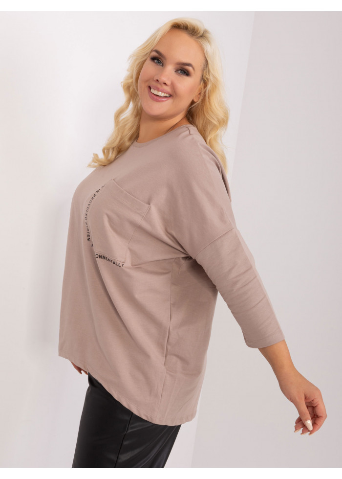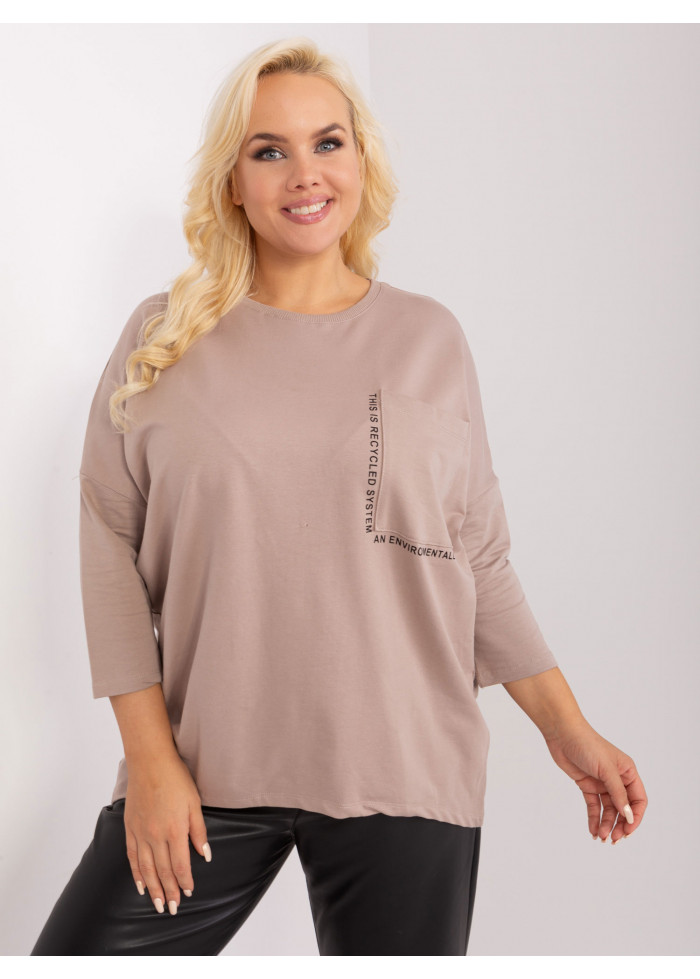 Dámske tričko s 3/4 rukávom, okrúhly výstrih, 1 náprsné vrecko, ozdobné nápisy, asymetrický strih, univerzálna veľkosť, miery modelky: výška 172 cm, prsia 103 cm, pás 73 cm, boky 103 cm., rozmer produktu meraného na plocho:, šírka pod plecami: 73 cm, dĺžka rukáva: 45 cm, celková dĺžka: vpredu: 64 cm, vzadu: 79 cm.