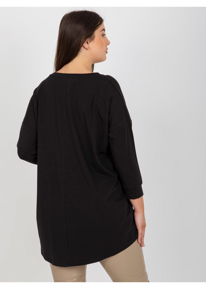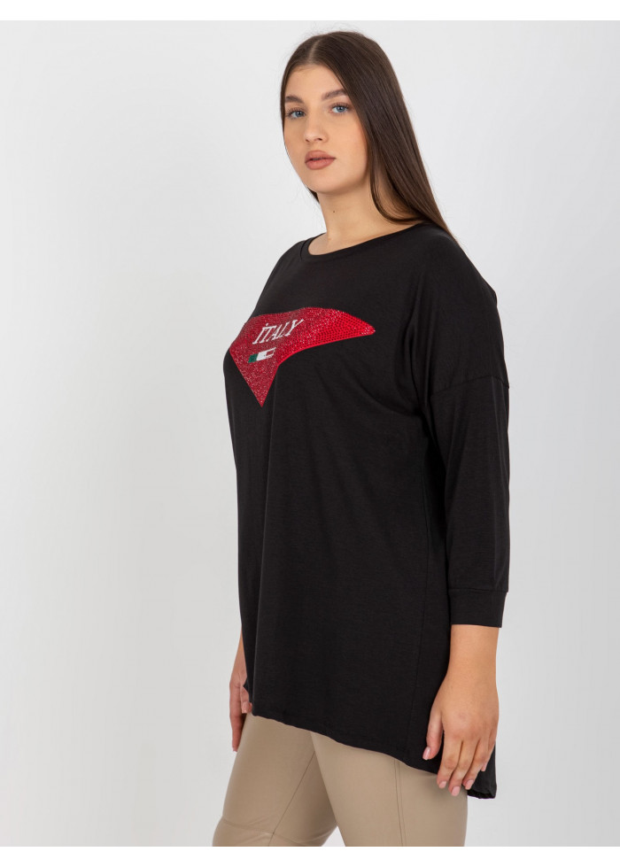 Bavlnené dámske tričko, 7/8 rukávy, asymetrický strih, ozdobné aplikácie, univerzálna veľkosť, miery modelky: výška: 174 cm, prsia: 100 cm, pás: 74 cm, boky: 107 cm, rozmer produktu meraného na plocho:, šírka pod plecami: 67 cm, dĺžka rukáva: 47 cm, celková dĺžka: 82 cm.